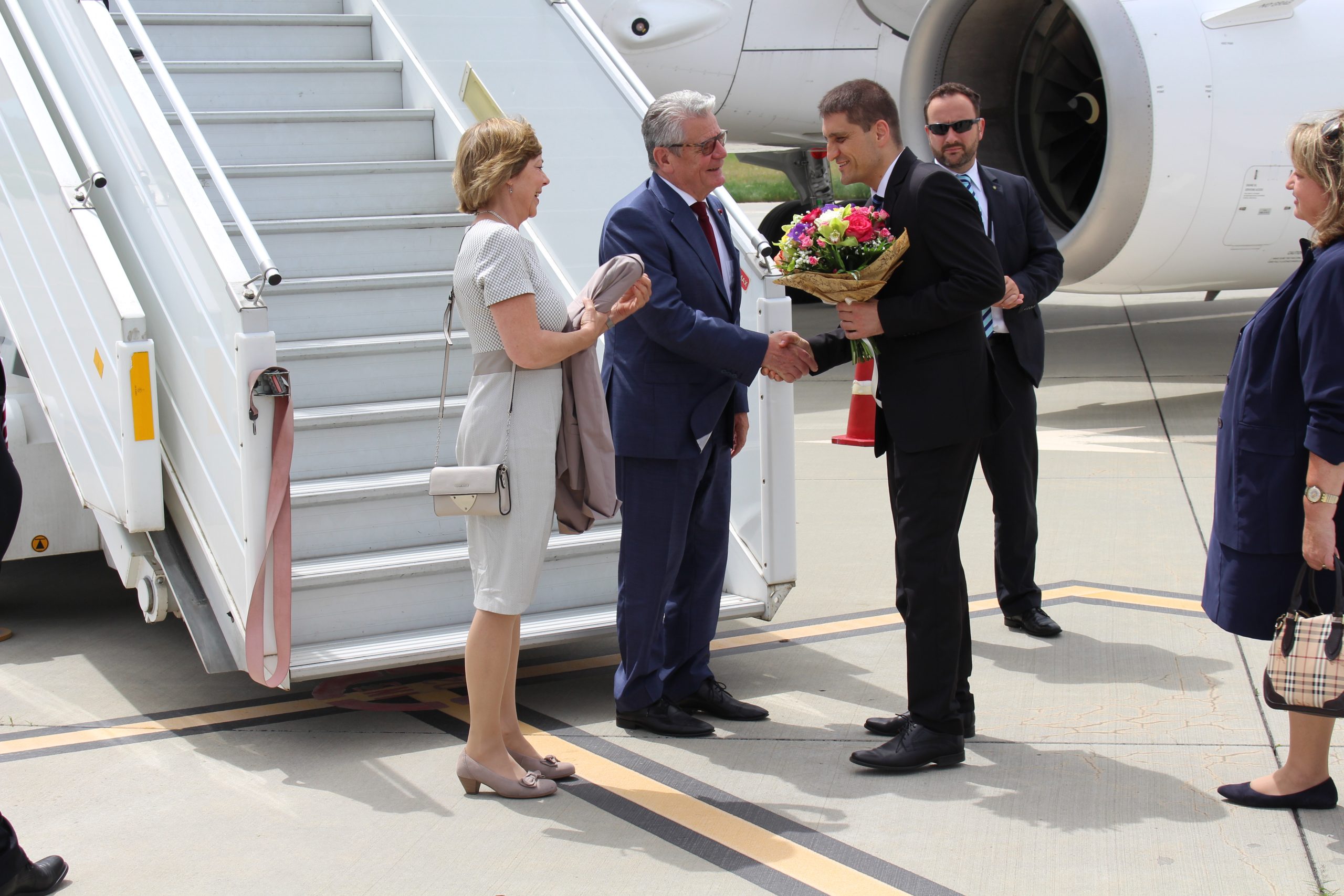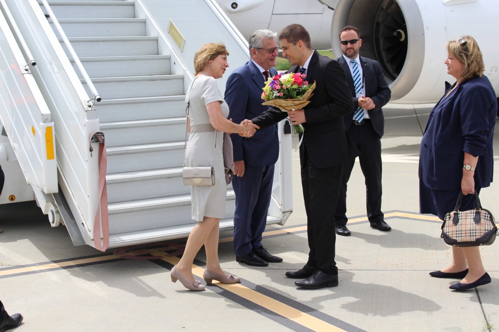 Prefectul Sibiului, Cristian Roman şi Consulul R.F. Germania la Sibiu, Judith Urban l-au întâmpinat la sosirea în aeroport pe Joachim Gauck, Preşedintele Republicii Federale Germania.