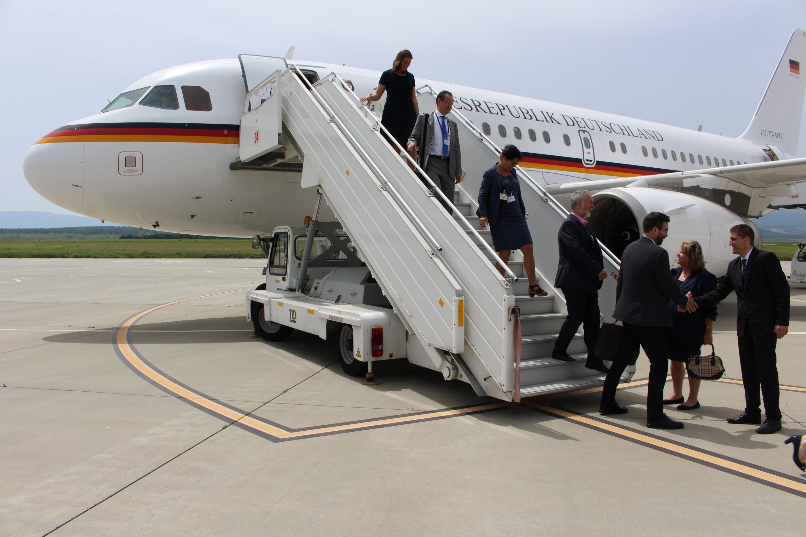 Aeronava specială (A 319) a sosit pe Aeroportul Internaţional Sibiu la ora 11.50, preşedintele Germaniei fiind însoţit de Daniela Schadt, dar şi de o delegaţie oficială, din care fac parte ambasadorul Germaniei la Bucureşti, Werner Hans Lauk, şi Bernd Fabritius, primul cetăţean român care a ajuns deputat în Bundestag.