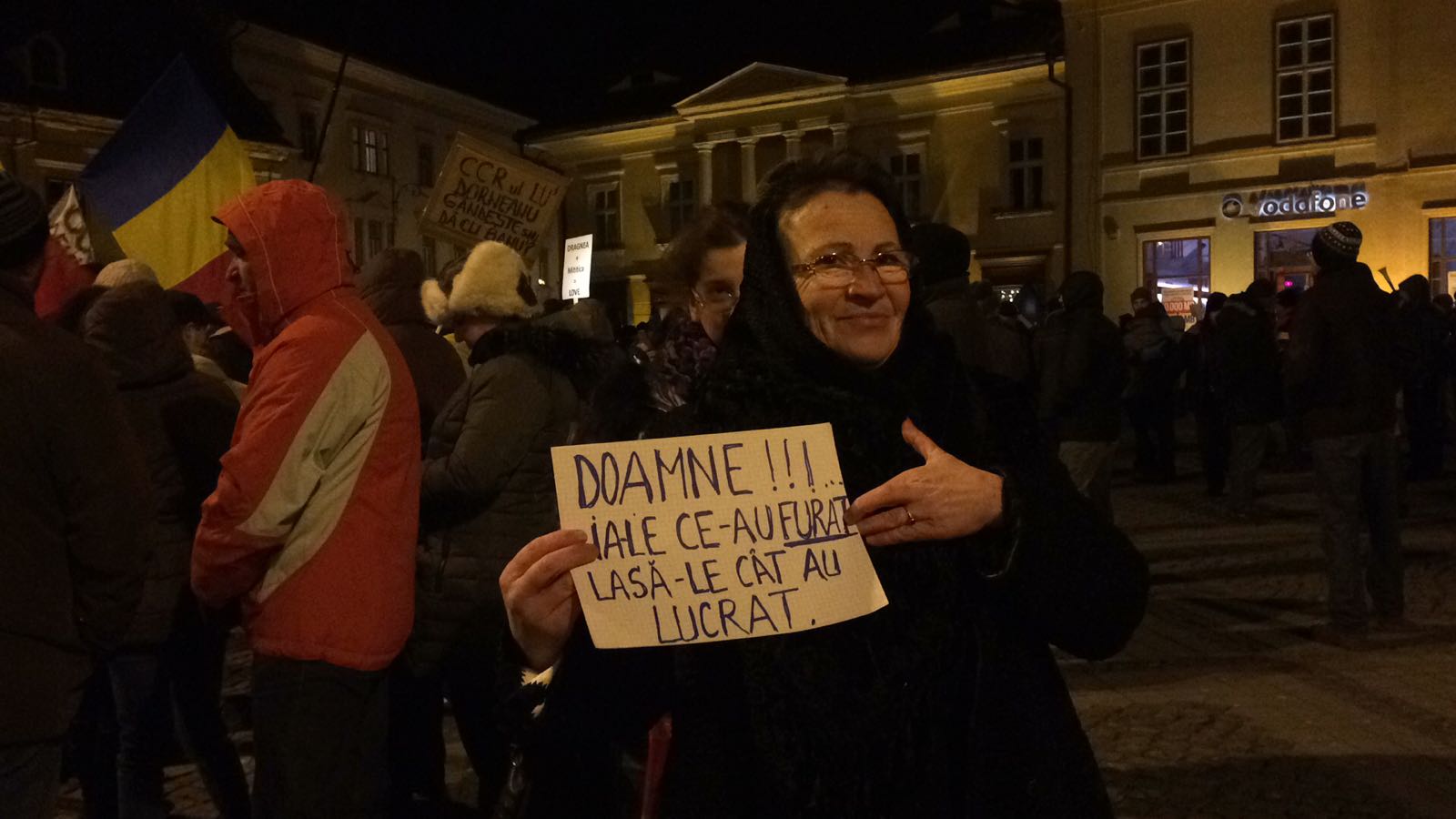 O femeie trecuta de prima tinerete se afla in piata cu o pancarta pe