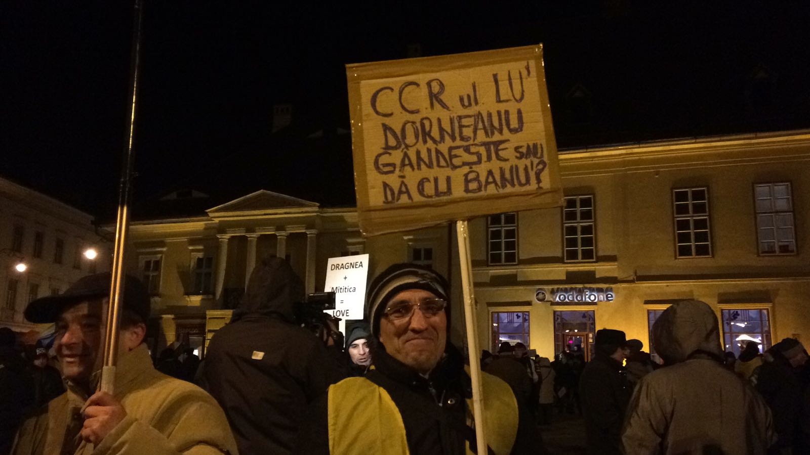 Sibienii prezenti in piata, al caror numar depaseste 1500, la 19.30, au si pancarte in care-l ironizeaza pe Liviu Dragnea, dar și pe membrii Curtii Constitutionate.
