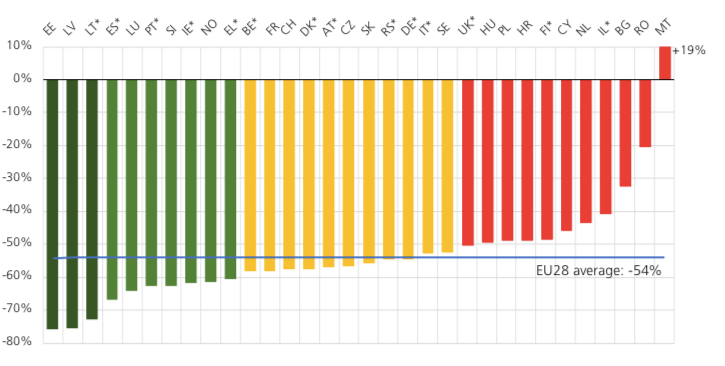 Al doilea grafic: Scăderea numărului de decese în 2017 raportat la 2001 este în România de aproximativ 20%, mult sub media UE situată la 54%.