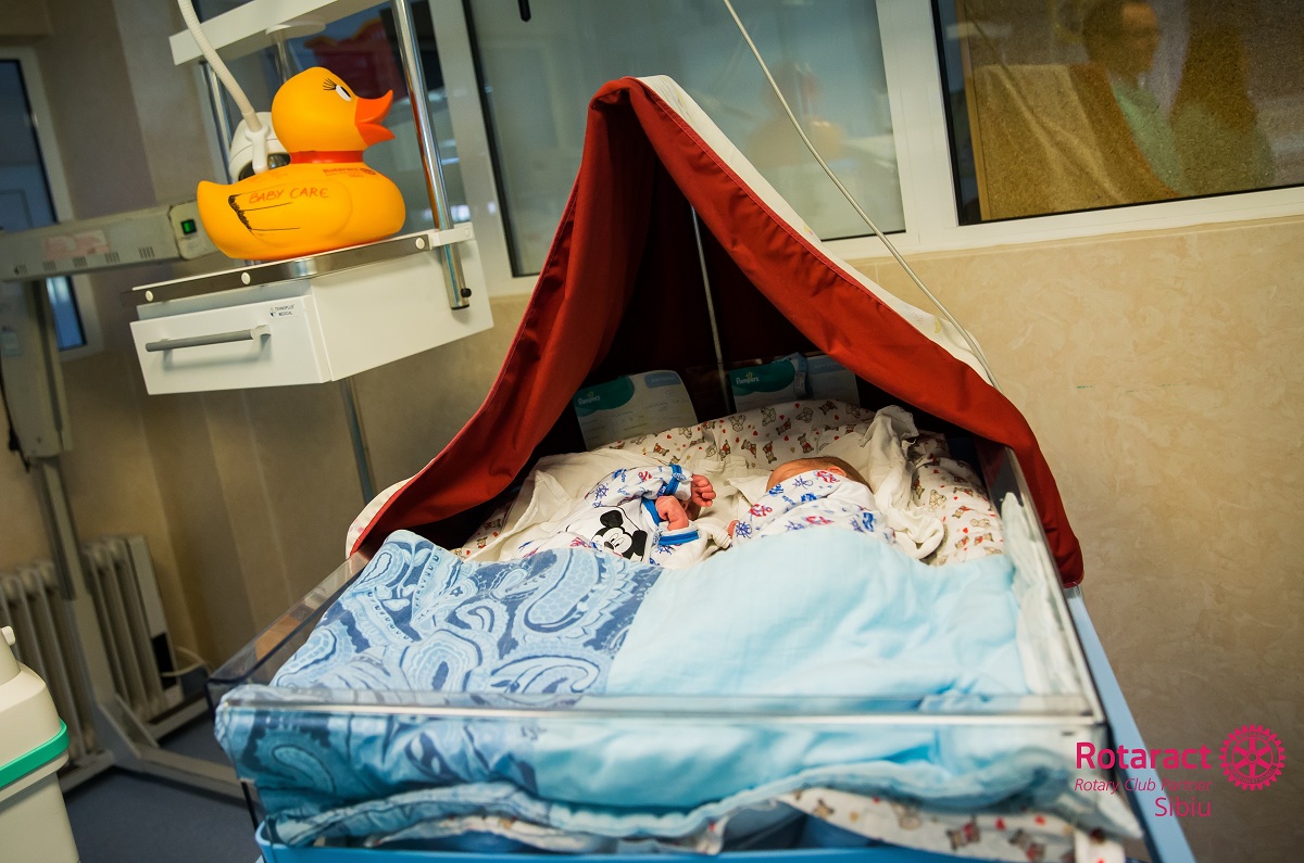 Prin intermediul acestei donații, Rotaract Club Sibiu a venit în sprijinul Asociației Baby Care Sibiu și astfel s-a reușit achiziționarea unui incubator special conceput pentru gemenii născuți prematur și a unei lămpi de fototerapie utilizată în tratamentul icterului neonatal.