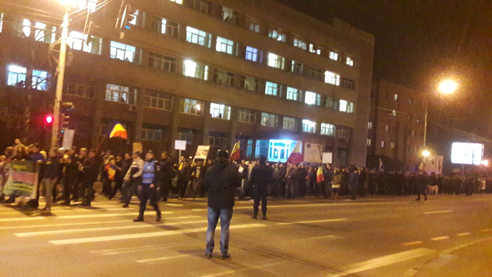 UPDATE: 19.50 Numarul protestatarilor a ajuns la cinci sute. Oamenii au marsaluit pe Bulevardul Corneliu Coposu, o banda a sensului de mers catre Piata Unirii fiind blocata de protestatari.