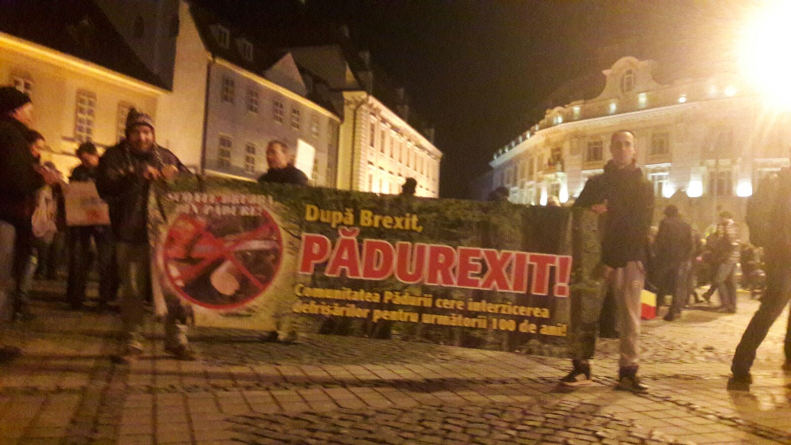 Protestatarii au un banner pe care scrie ”Dupa Brexit, Pădurexit! Comunitatea Pădurii cere oprirea defrisarilor pentru urmatorii 100 de ani”.