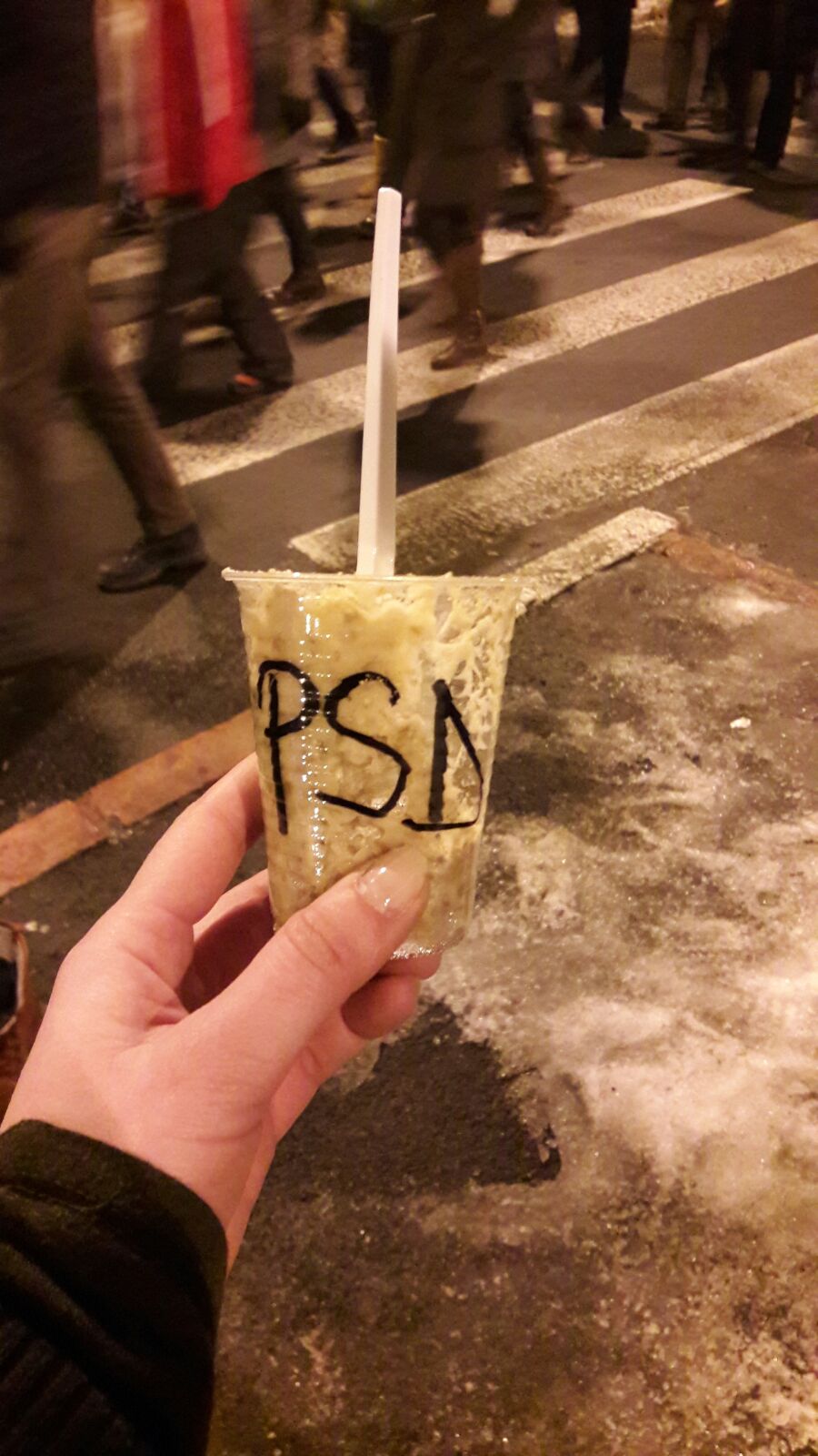 UPDATE 20.45 O sibianca de pe Mihai Viteazu a le-a oferit manifestantilor 50 de pahare de plastic cu coliva pe care a pregatit-o bunica ei, impreuna cu vecinii. Pe pahare scria „PSD”.