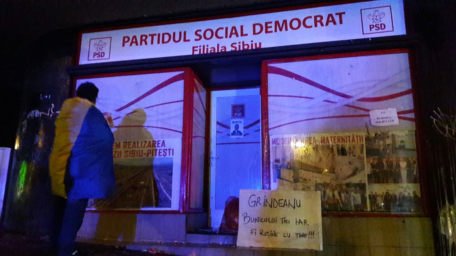 UPDATE 21.30 In fata sediului organizatiei municipale a PSD, manifestantii striga ~”Dragnea nu fii trist, o sa fii taximetrist”. In plus, protestatarii au lasat la usa sediului o pancarta pe care au scris: „Grindeanu, bunicului tau, i-ar fi rusine cu tine”.