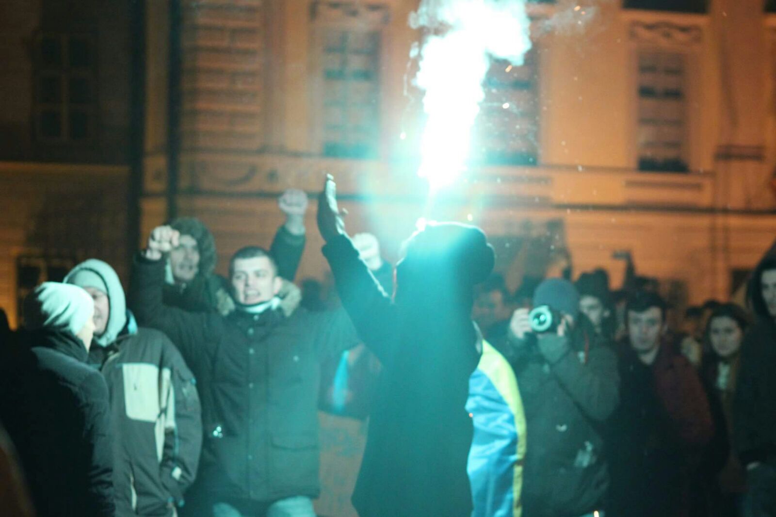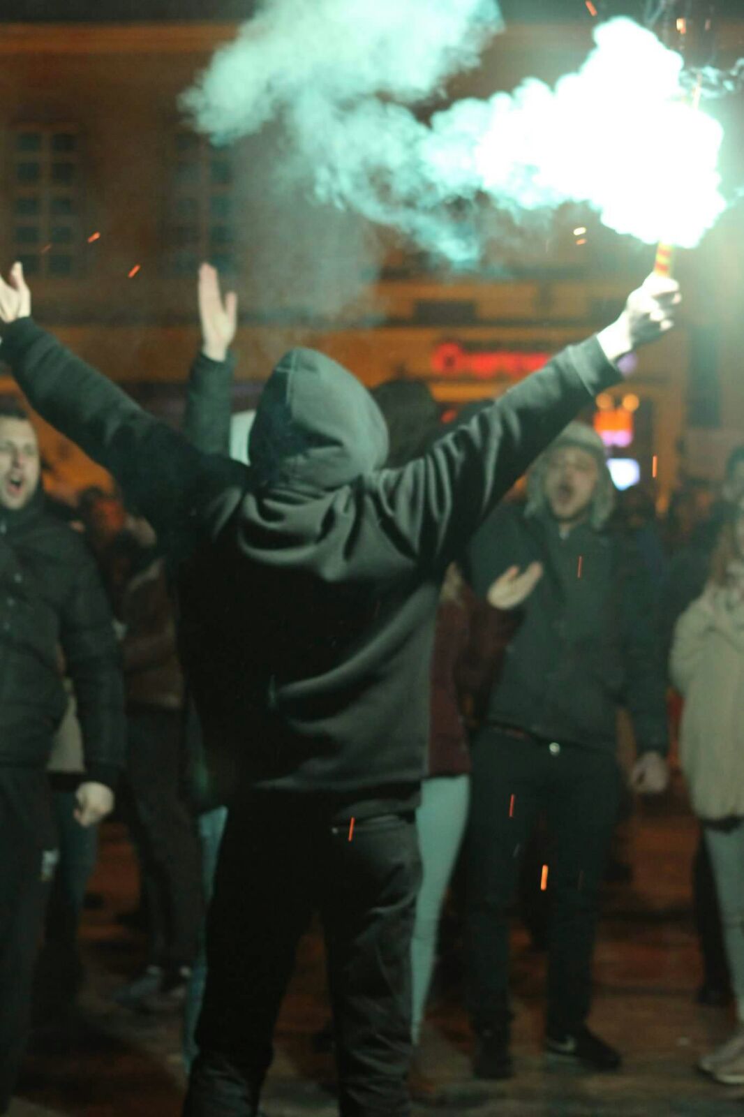 UPDATE 22.10 Un tanar a aprins o fumigena in multimea stransa in Piata Mare, iar alti doi au sarit sa vada ce se intampla. Cei trei erau pe punctul de a se incaiera, dar au intervenit jandarmii care i-au scos din multime pe toti trei.