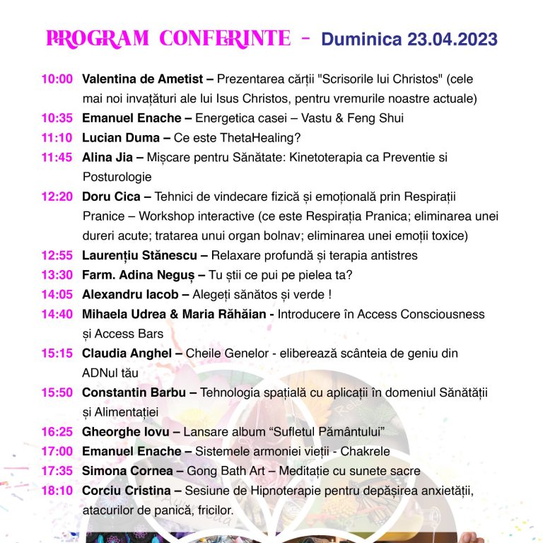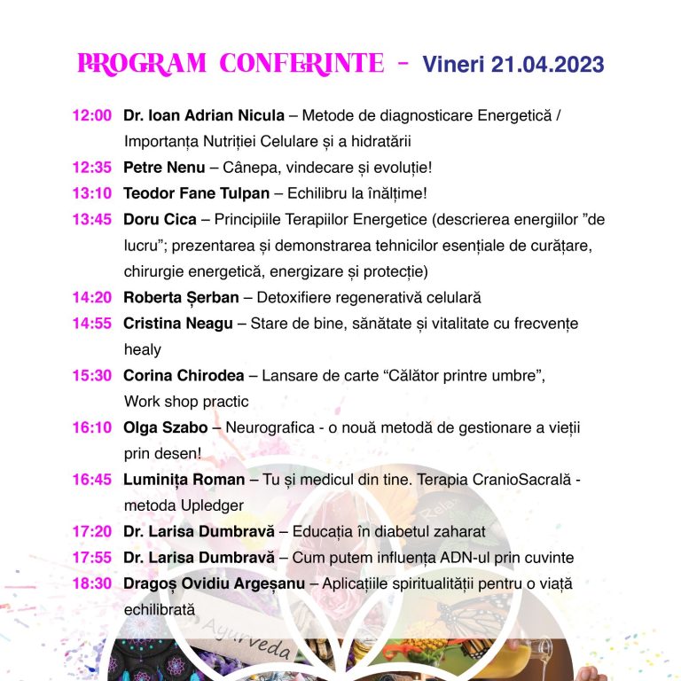 Evenimentul va găzdui peste 50 de expozanți și conferențiari internaționali consacrați din diferite domenii: Apicultură; Astrologie; Ayurveda; Acupunctură; Chiropractică; Citirea Genelor; Cristaloterapie; Detergenți Bio; Dispozitive Orgonice; Homeopatie; Human Design; Neuro-Grafică; Numerologie; Reflexoterapie; Suplimente Nutritive; Terapie Acces Bars; Terapie Bowen; Terapie Cranio-Sacrală; Parapsihologie; Sacroterapie; Stomatologie Biologică; Uleiuri esențiale; BioEnergoterapie; Bijuterii… etc.