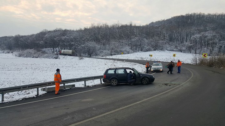 UPDATE 8.20 – 3 victime prezintă contuzii și sunt transportate la spital. O a patra victimă refuză transportul la spital. Poliția Rutieră spune că un autoturism condus spre Mediaș de un bărbat în vârstă de 32 de ani a pătruns pe contrasens într-o curbă din cauza vitezei și a intrat în coliziune cu un TIR.