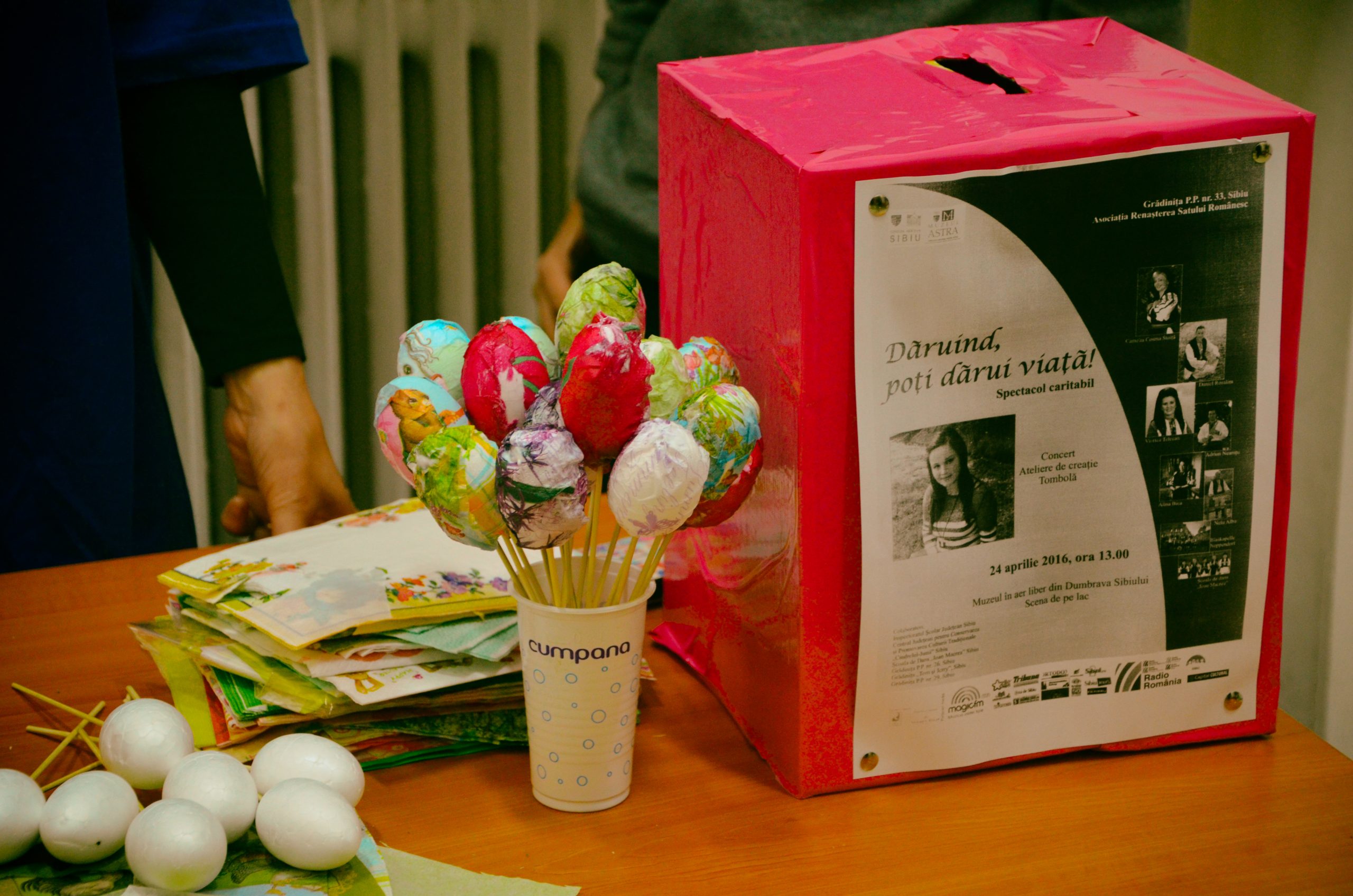 De asemenea, lângă sală a fost organizată o tombolă cu produse confecţionate de micuți de la toate grădiniţele din Sibiu. De aici nu au lipsit nici suporturile pentru ouă colorate și nici tablourile viu colorate, în ton cu sărbătorile pascale. Mai mult, au fost organizate 4 ateliere de creaţie, unde zeci de copii şi educatoare au creionat felicitări, coşuleţe şi alte suveniruri.