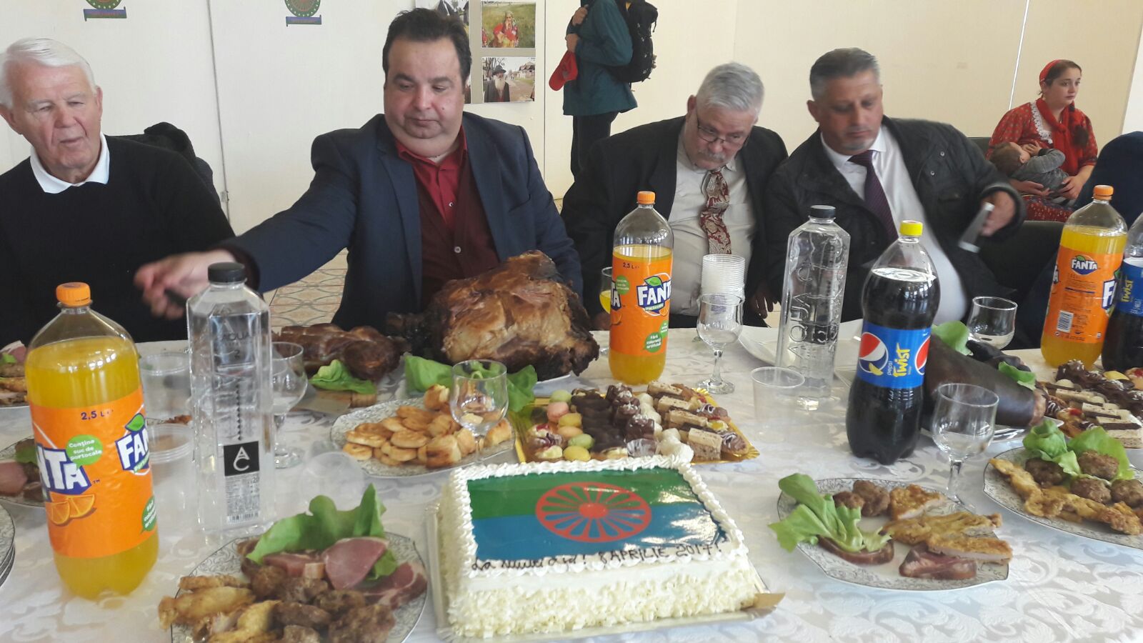 După ce au cinstit memoria romilor decedaţi, Dorin Cioaba a pregătit un adevărat festin pentru invitaţii săi. Masa a fost umplută de bunătăţi tradiţionale, toate pregatite de femeile din comunitate. „Pentru aceată zi deosebită am pregătit un tort al romilor. Este primul tort cu steagul romilor. Am pregătit însă mai multe preparate tradiţionale, de ale noastre, rânza, avem şi beci. Sunt preparatele noastre speciale pentru zile de sărbătoare.”