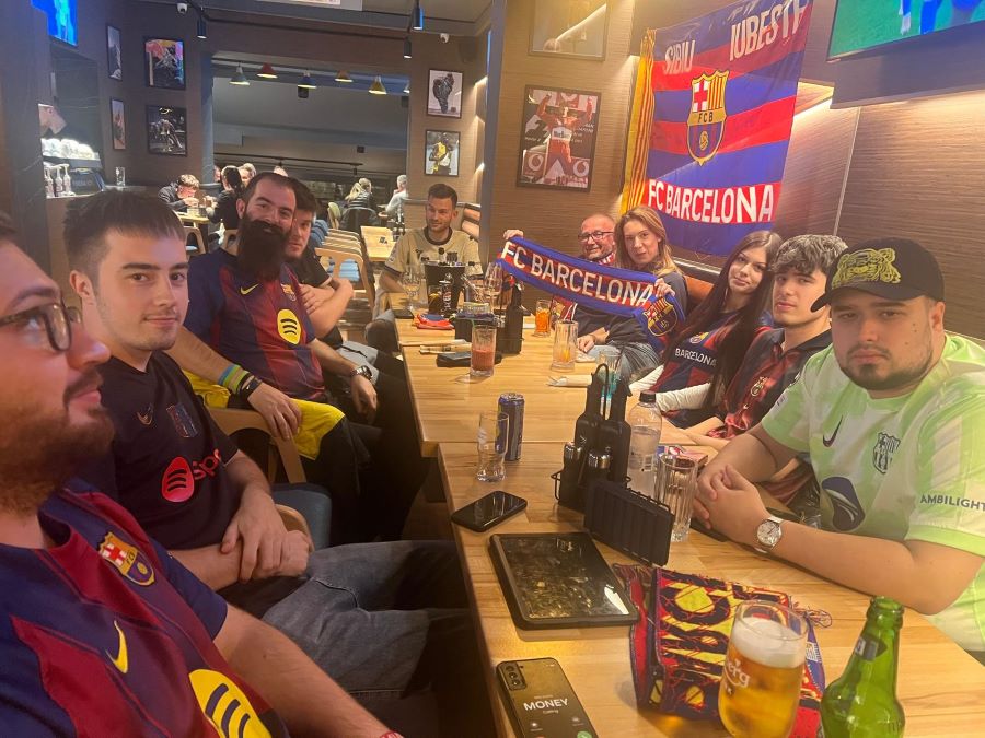 Este seară de Liga Campionilor, în afara aerul rece al toamnei se mai simte ceva plutind în atmosferă. Mergem la locul unde se întâlnește fanclubul Barcelonei din Sibiu. Și îi văd adunați pe toți. Nu poți confunda culorile „blau-grana”, mai ales că steagul echipei lor favorite stă totem în spatele lor, iar fanii care mai de care mai echipați, cu tricouri, fulare.