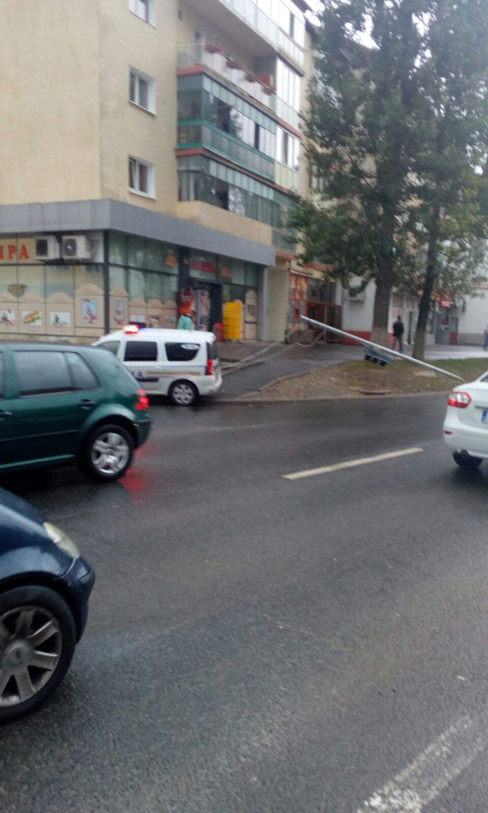 In aceasta dimineata, soferul unei autoutilitare de aprovizionare a agatat firele din zona si a doborat stalpul pe care este montat semaforul.
