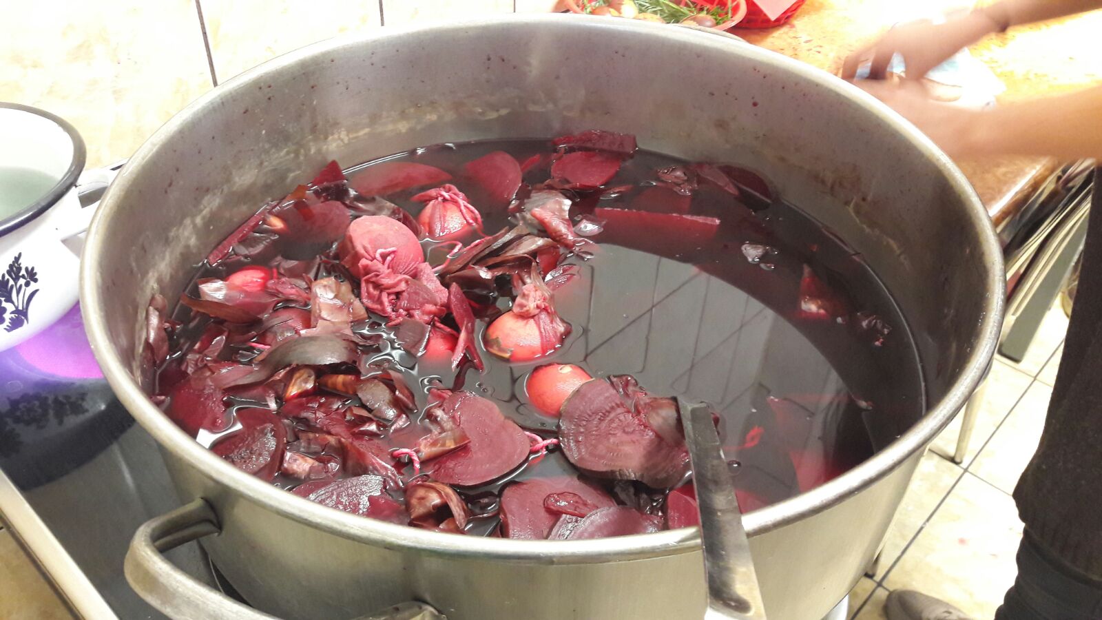 „În primul rând se degresează ouăle, apoi pe fiecare ou punem câte o frunză, punem ouăle în ciorapi pe care îi legăm, apoi ouăle pregătite le punem în apă cu sfeclă roșie și frunze de ceapă roșie. Le lăsăm la fiert cam 5-6 minute”, explică Diana Mărginean.