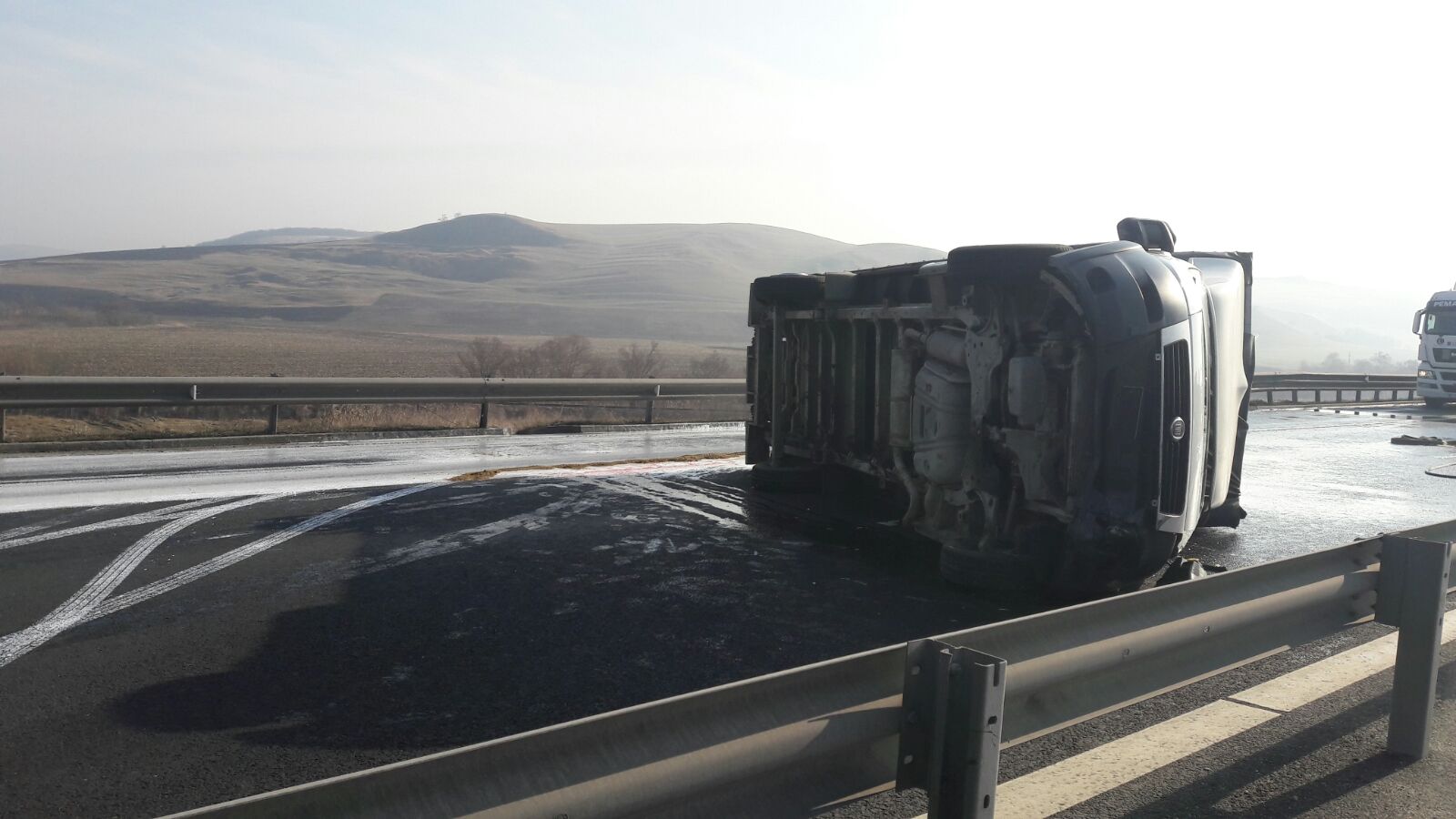 In accident este implicata o camioneta incarcata cu vopsea lavabila. Soferul acesteia povesteste ca a avut explozie la o roata si nu a avut cum sa redreseze masina care s-a rasturnat.