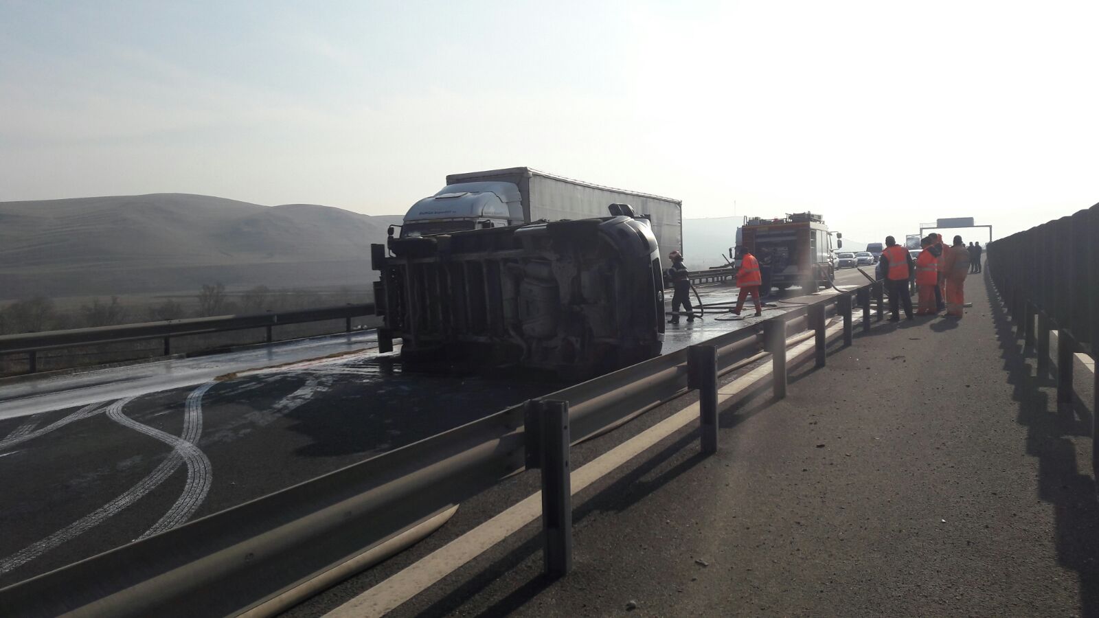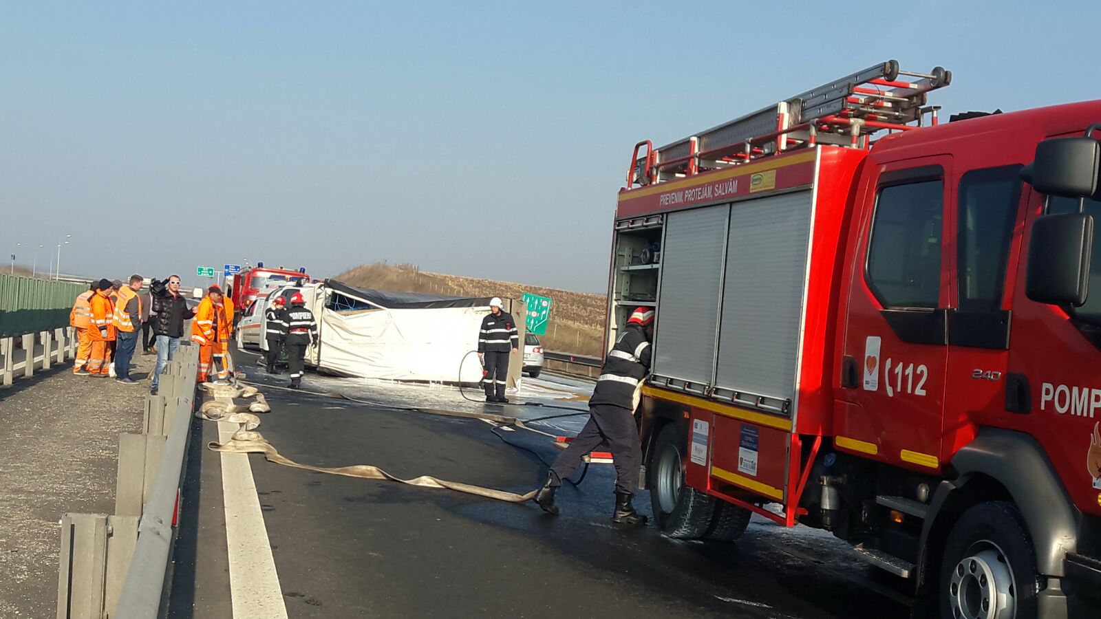 Un TIR s-a rasturnat pe autostrada Sibiu – Orastie, sensul Sibiu – Alba, in dreptul localitatii Cunta.