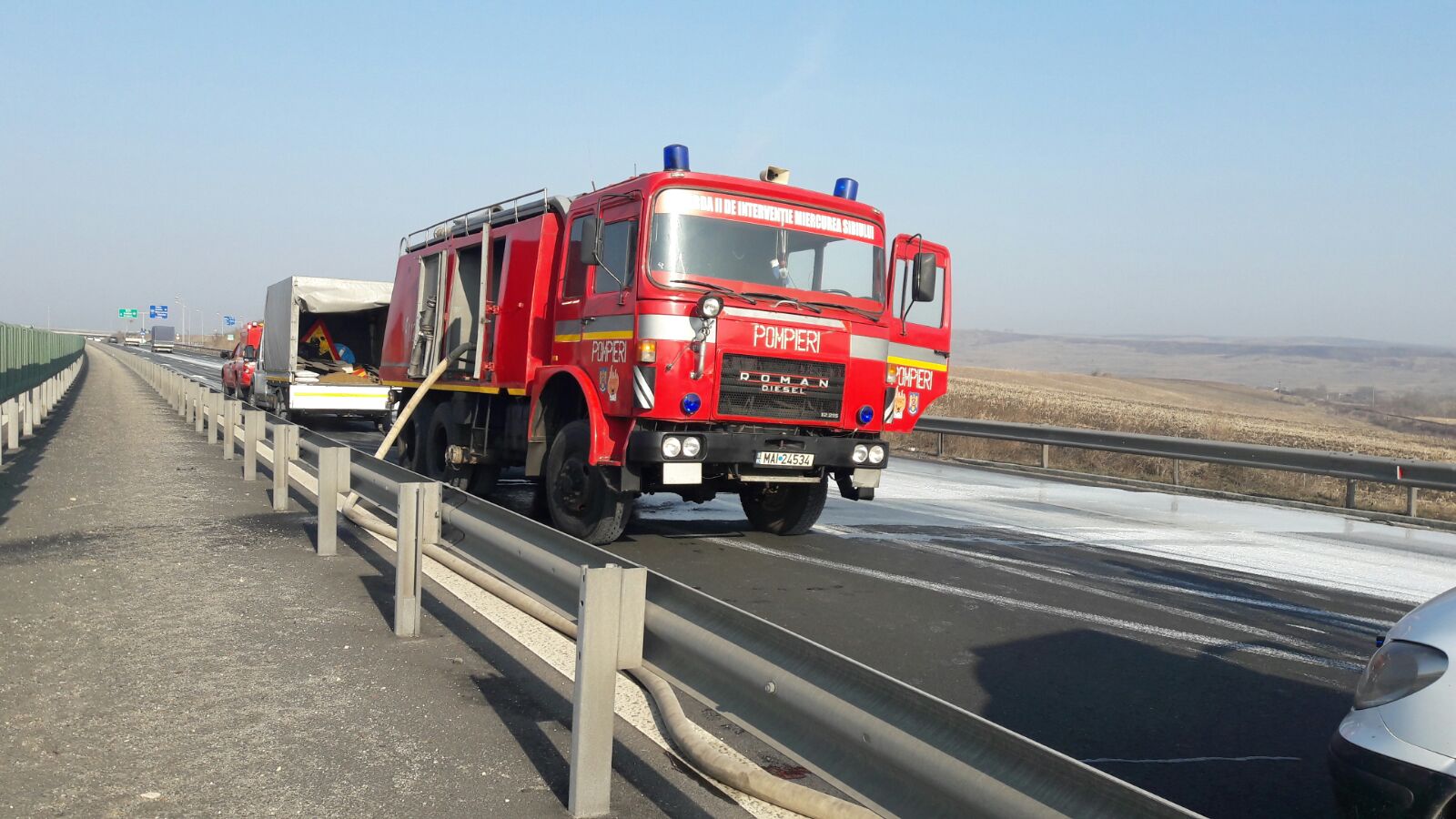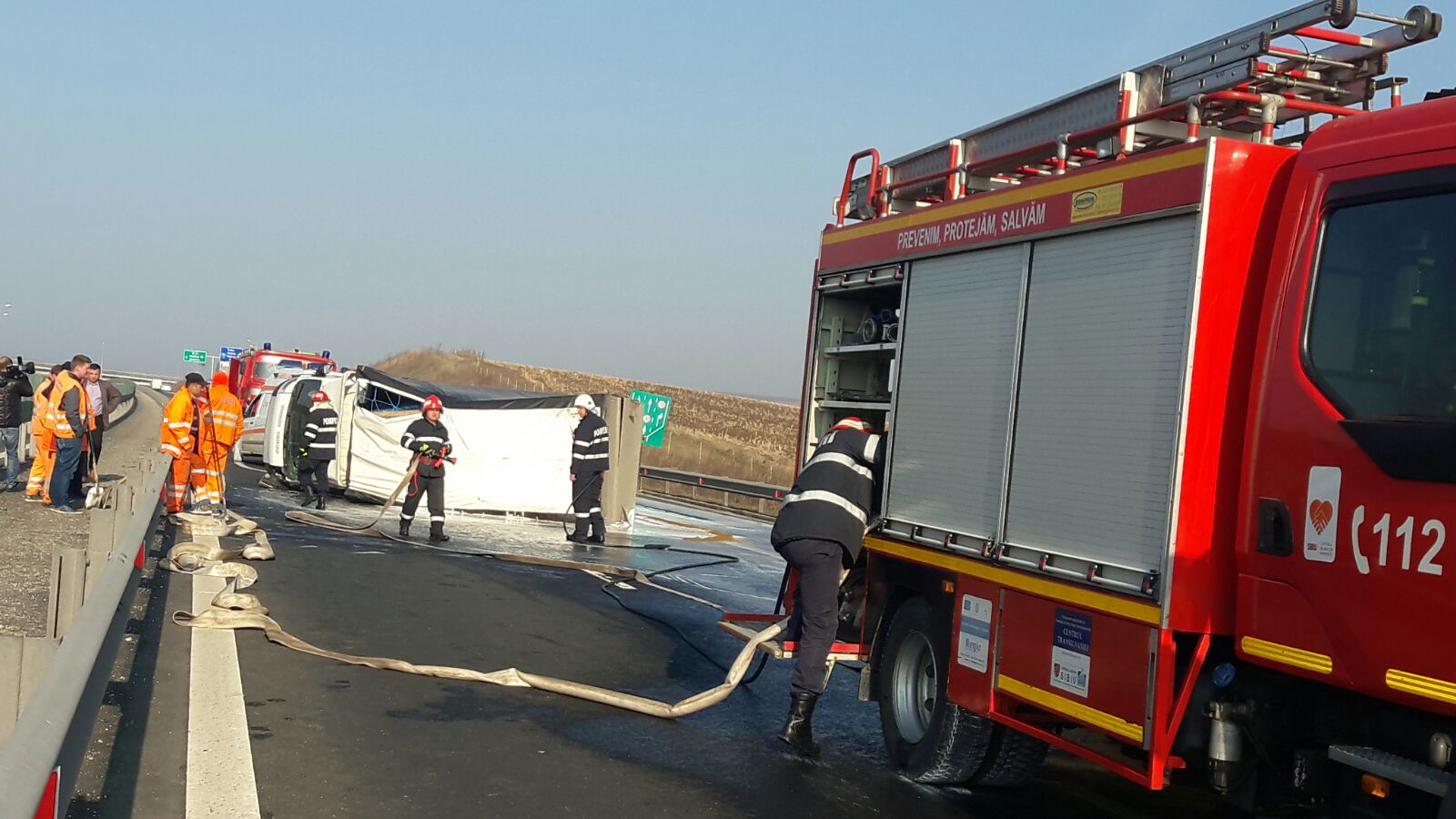 Potrivit ISU Sibiu, au existat scurgeri de vopsea lavabila pe sosea, iar soferul este rănit usor. Mai multe echipaje de pompieri intervin la fata locului pentru a asigura zona si a curata soseaua.