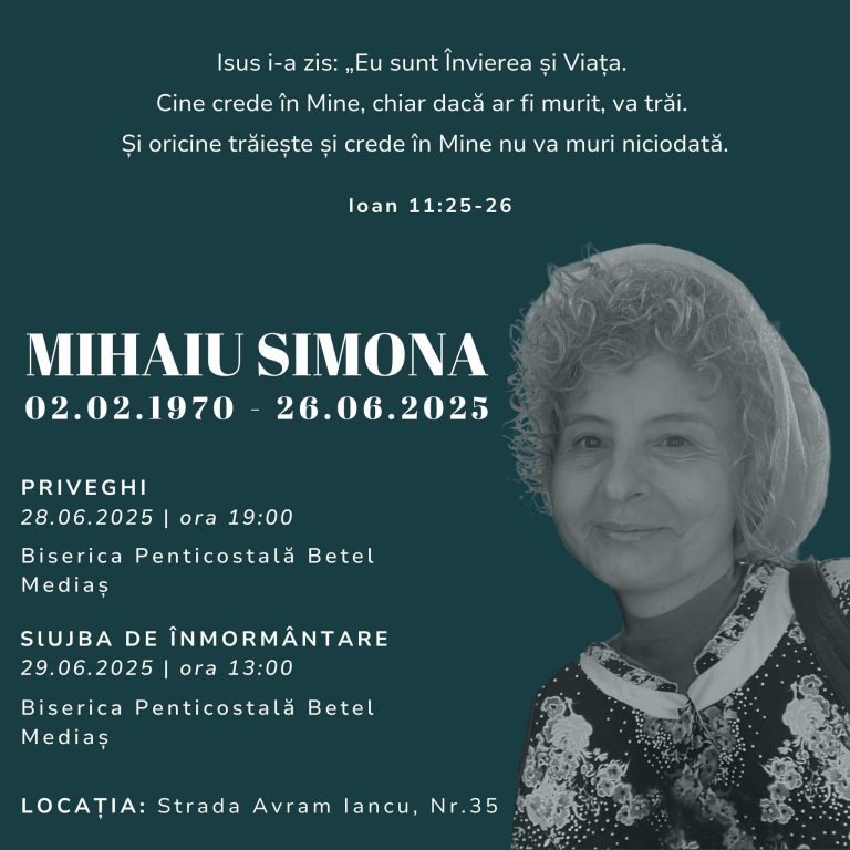 Priveghiul va avea loc în această seară de la ora 19.00 iar slujba de înmormântare va avea loc mâine, 29.06.2025, de la ora 13.00 la Biserica Penticostală Betel Mediaș de pe Str. Avram Iancu, nr. 35.