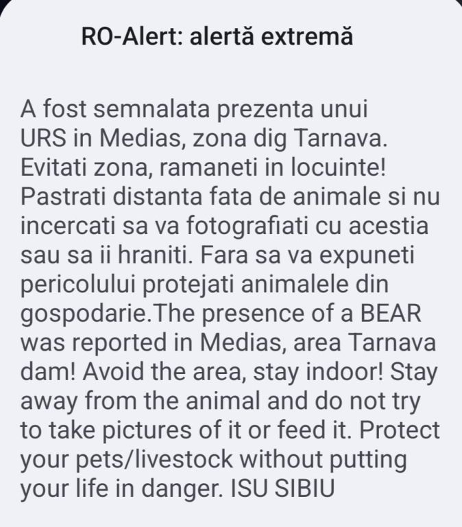 Medieșenii au primit, sâmbătă dimineața, mesaje RO-ALERT prin care se anunța prezența unui urs în oraș.