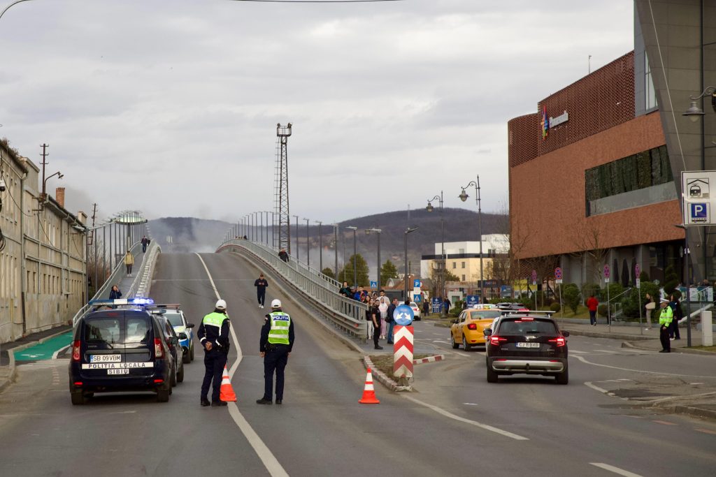 Polițiștii rutieri deviază traficul spre străzile adiacente.