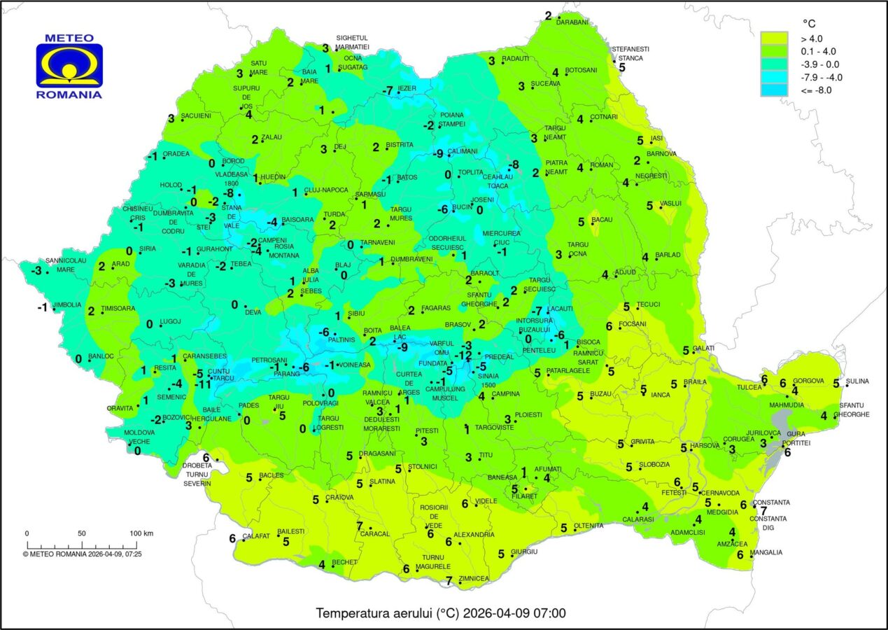 Dimineața de 9 aprilie 2026 a adus în mai multe orașe din România temperaturi de iarnă, cea mai scăzută fiind înregistrată la Roșia Montană.