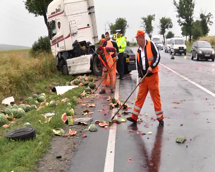Accident marți dimineața la intersecția Miercurea Băi cu Gârbova. Un TIR și un microbuz încărcat cu pepeni s-au ciocnit în această dimineață în jurul orei 8.30. Inspectoratul de Poliție al județului Sibiu informează că o persoană a fost rănită în urma accidentului rutier. Traficul s-a desfășuratcu dificultate în zona accidentului rutier câteva zeci de minute. „Șoferul TIR-ului circula spre Sibiu, iar la ieșirea dintr-o curbă, pe fondul neadaptării vitezei a pătruns pe contrasens și a intrat în coliziune cu un microbuz. Șoferul TIR-ului și al microbuzului au fost răniți în urma accidentului rutier”, spune Luciana Lazăr, purtătorul de cuvânt al IPJ Sibiu.