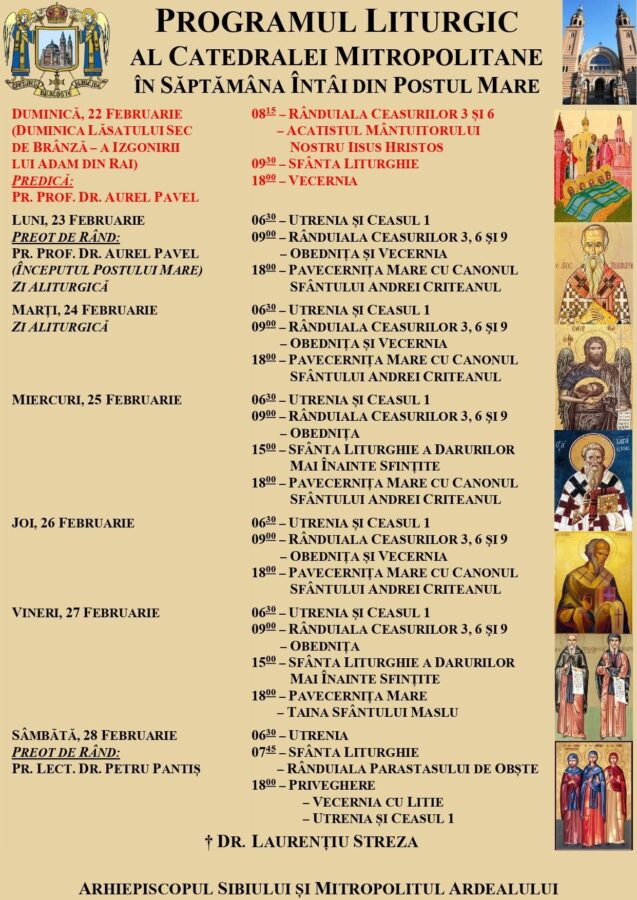 Programul liturgic al primei săptămâni la Catedrala Mitropolitană în imaginea de mai jos.