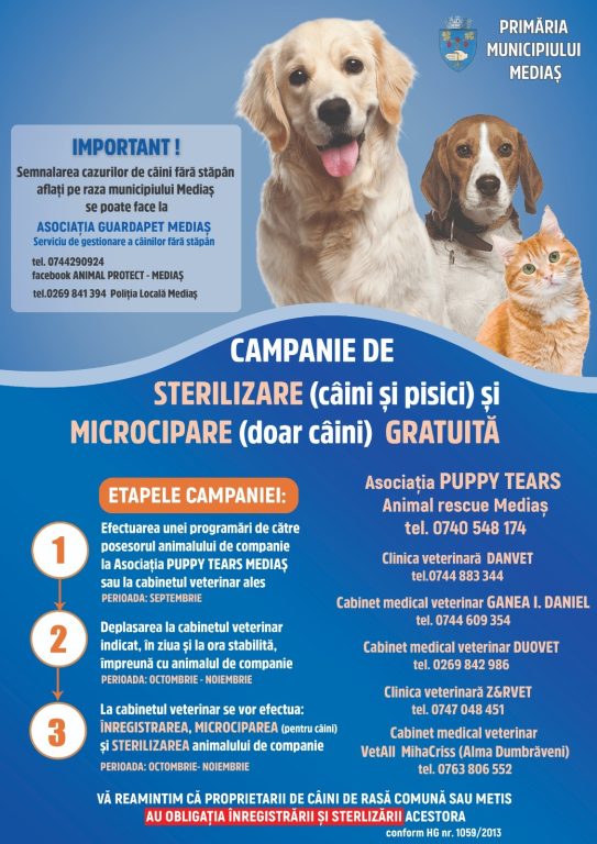 Primăria Municipiului Mediaș, în parteneriat cu Asociația Puppy Tears Animal Rescue, lansează o campanie de sterilizare gratuită destinată câinilor și pisicilor de rasă comună sau metiși, cu stăpân, de pe raza orașului.