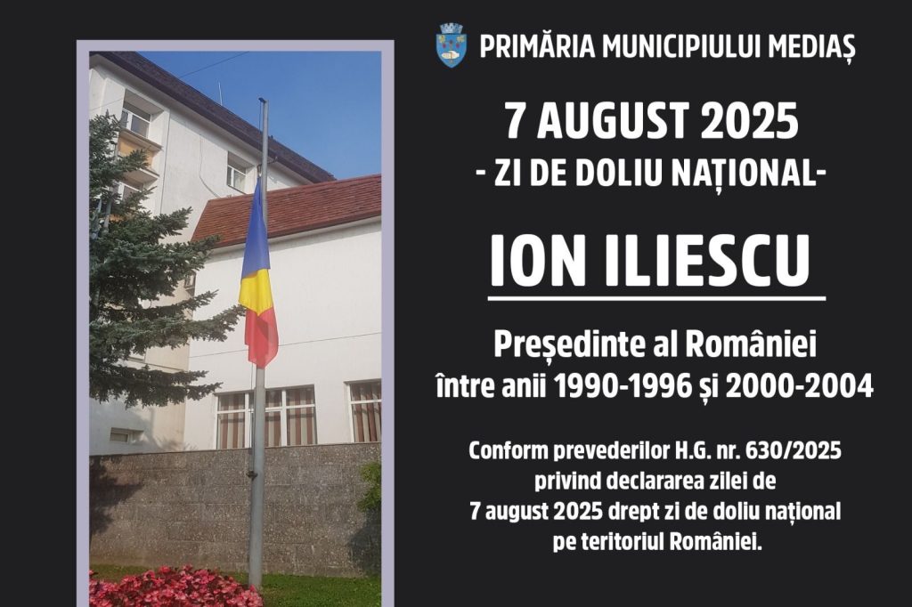 Primăria Municipiului Mediaș respectă prevederile H.G. nr. 630/2025 privind declararea zilei de 7 august 2025 drept zi de doliu național pe teritoriul României, în memoria lui Ion Iliescu, fost președinte al României între anii 1990-1996 și 2000-2004.