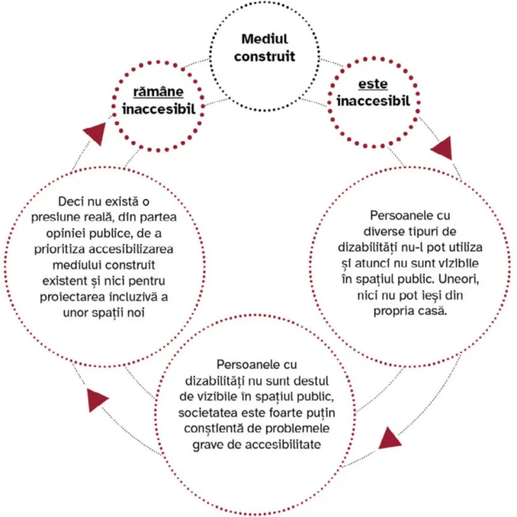 Nu e de mirare că nu vedem mai multe persoane cu dizabilități în jurul nostru. Lumea din jur este atât de puțin accesibilă pentru ei încât preferă să rămână în spațiul restrâns al casei. Cei de la Spații publice fără bariere au ilustrat grafic cercul vicios în care sunt prinse aceste persoane și aparținătorii lor.