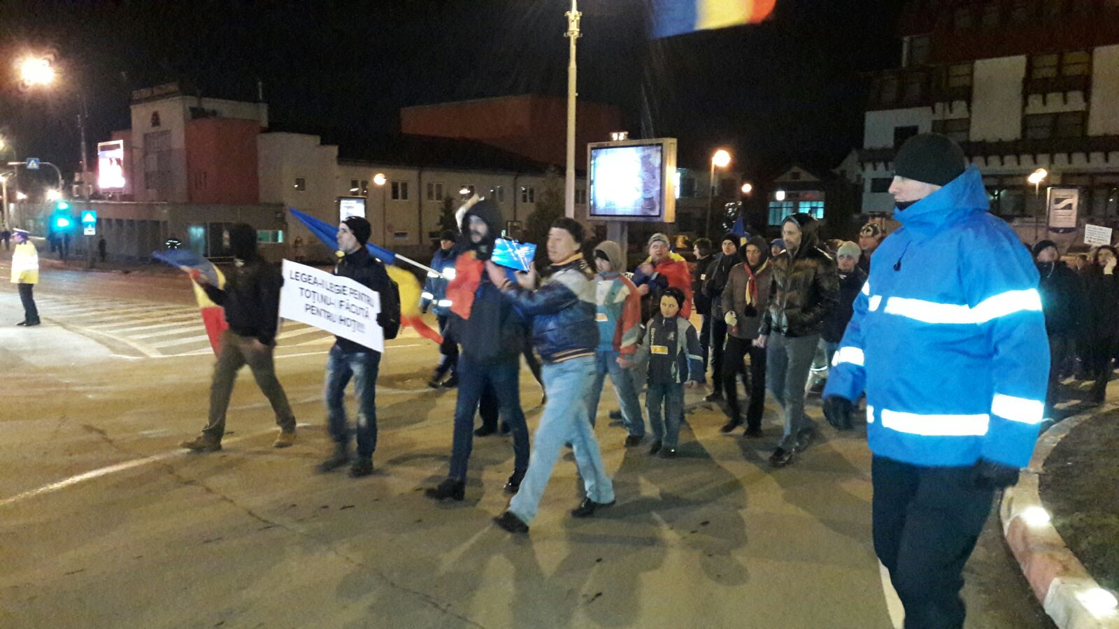 Scandând „Hoții”, „PSD Ciuma roșie” și „O dorință sinceră, România liberă”, protestatarii au făcut traseul scurt cu care s-au obișnuit în ultimele câteva zile, respectiv până la sensul giratoriu din Piața Unirii, iar apoi s-au întors în Piața Mare.