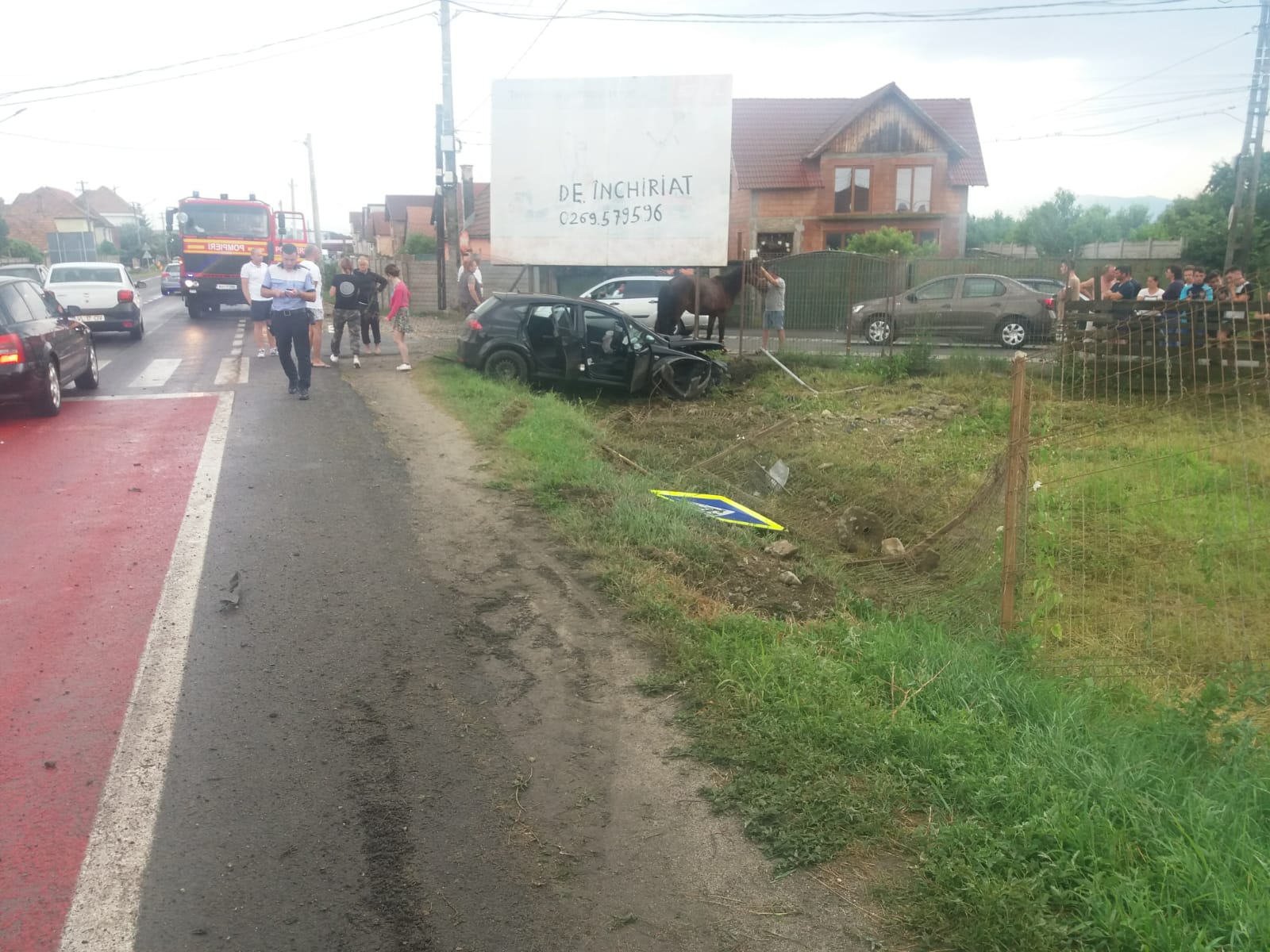 Potrivit polițiștilor, șoferița, în vârstă de 49 de ani, în timp ce conducea spre Sibiu, pe fondul vitezei neadaptate, a pierdut controlul volanului, a ieșit în afara părții carosabile în stânga, a acroșat un auto parcat, a revenit pe carosabil și a ieșit din nou în dreapta, unde a lovit gardul și calul aflat în apropiere.