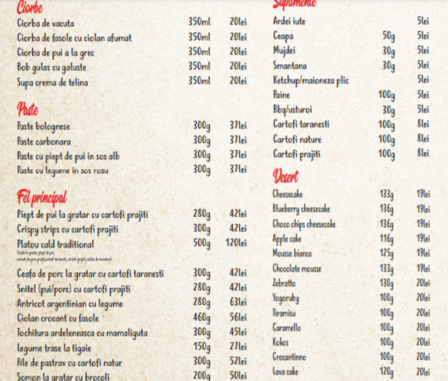 Un exemplu din meniul unui restaurant din Păltiniș arată că patru porții de ciorbă, două porții de paste și două porții de pui la grătar cu cartofi și băuturi costă 280 de lei. Evident, o singură masă pe zi nu este suficientă pentru a acoperi toate nevoile alimentare.