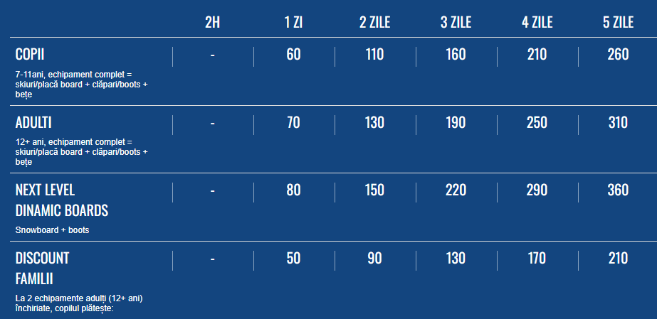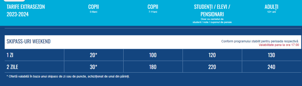 Dacă intenționați să vă bucurați de un weekend la munte, este important să știți că prețurile pentru o noapte de cazare variază între aproximativ 300 și 1.045 de lei. Pentru un skipass de weekend (valabil pentru două zile), un adult plătește 240 de lei, iar cei care vin însoțiți de cei mici trebuie să scoată din buzunar între 30 de lei (pentru copii între 0-6 ani) și 220 de lei (pentru elevi și studenți). Prin urmare, o familie cu doi copii (între 7-11 ani) ar putea cheltui 1.320 de lei pentru două zile de distracție.