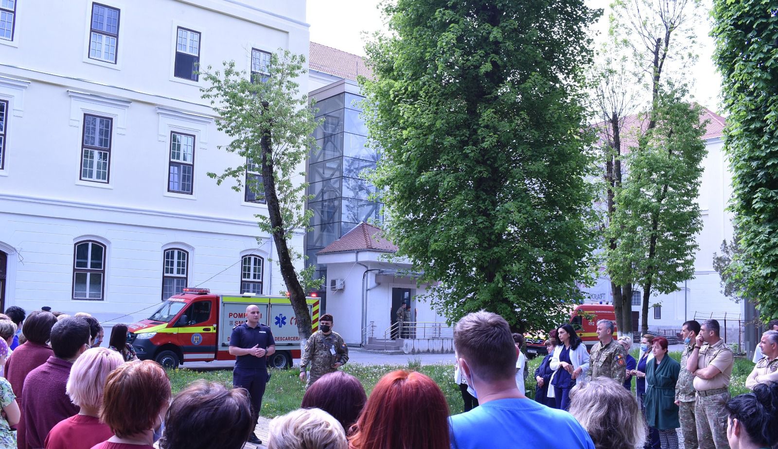 Pompierii militari ai Inspectoratului pentru Situații de Urgență “Cpt. Dumitru Croitoru” al Județului Sibiu au desfășurat un exercițiu la Spitalul Militar de Urgență ”Dr. Alexandru Augustin” Sibiu. Scenariul stabilit a fost stingerea unui incendiu izbucnit la etajul II al spitalului, unde se afla Secția Medicină Internă, în care au fost surprinse două persoane.