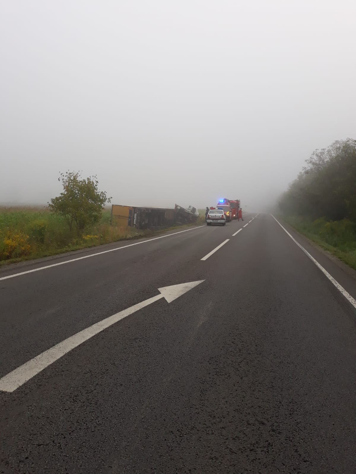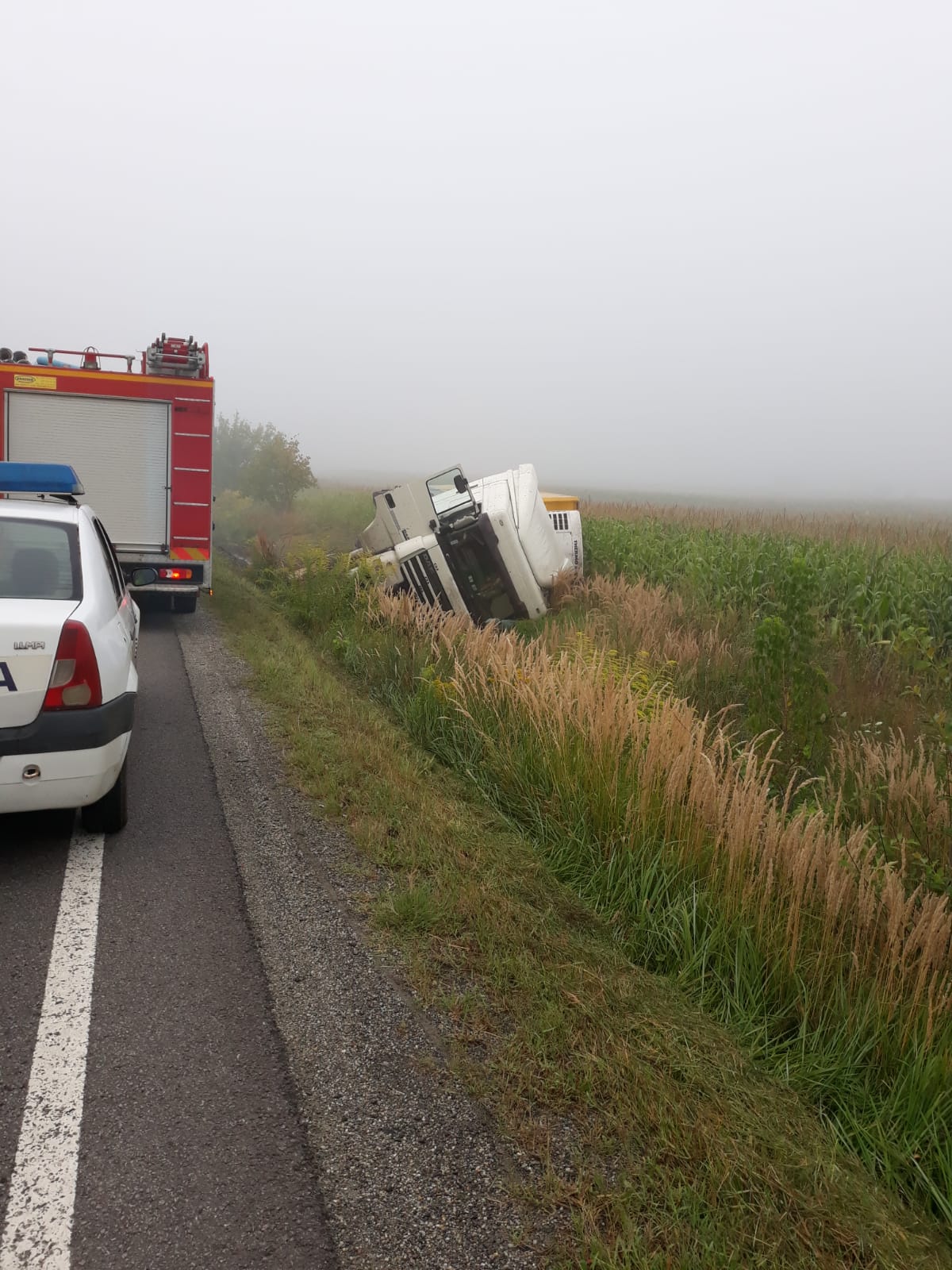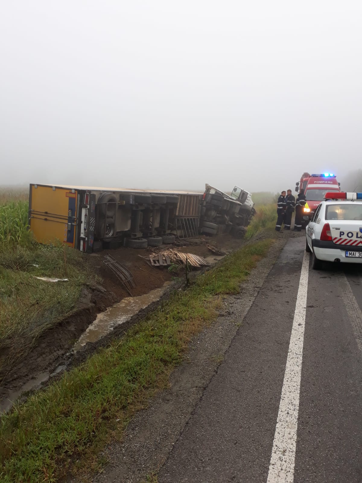 Un TIR s-a răsturnat pe DN14, între Axente Sever și Agârbiciu, sâmbătă dimineață, după ce șoferul ar fi adormit la volan.