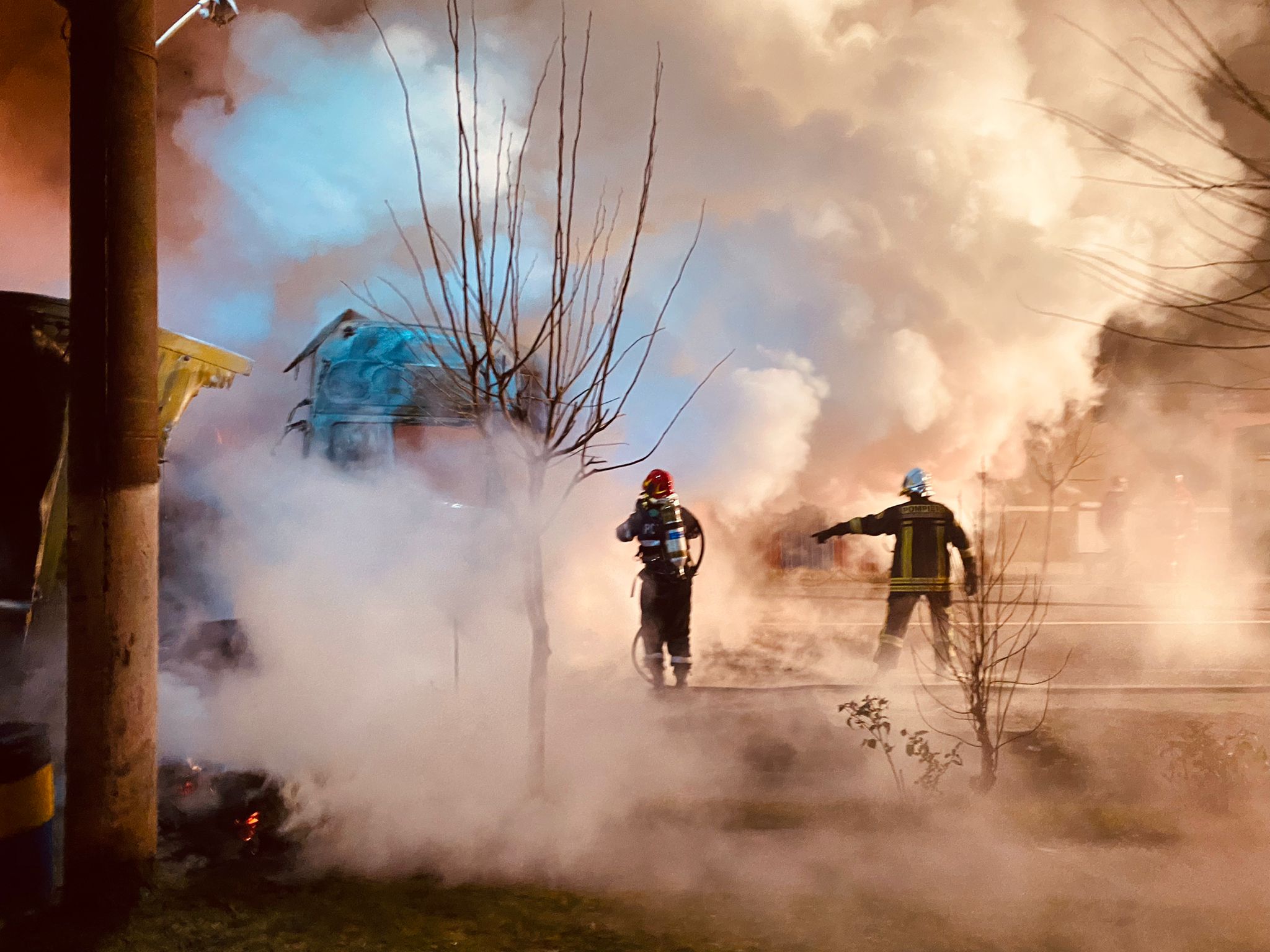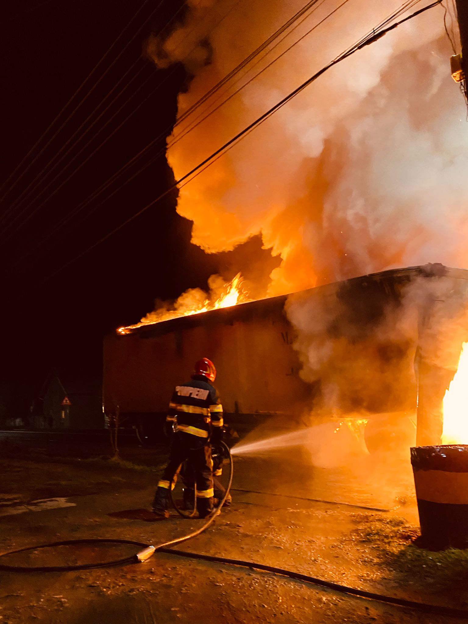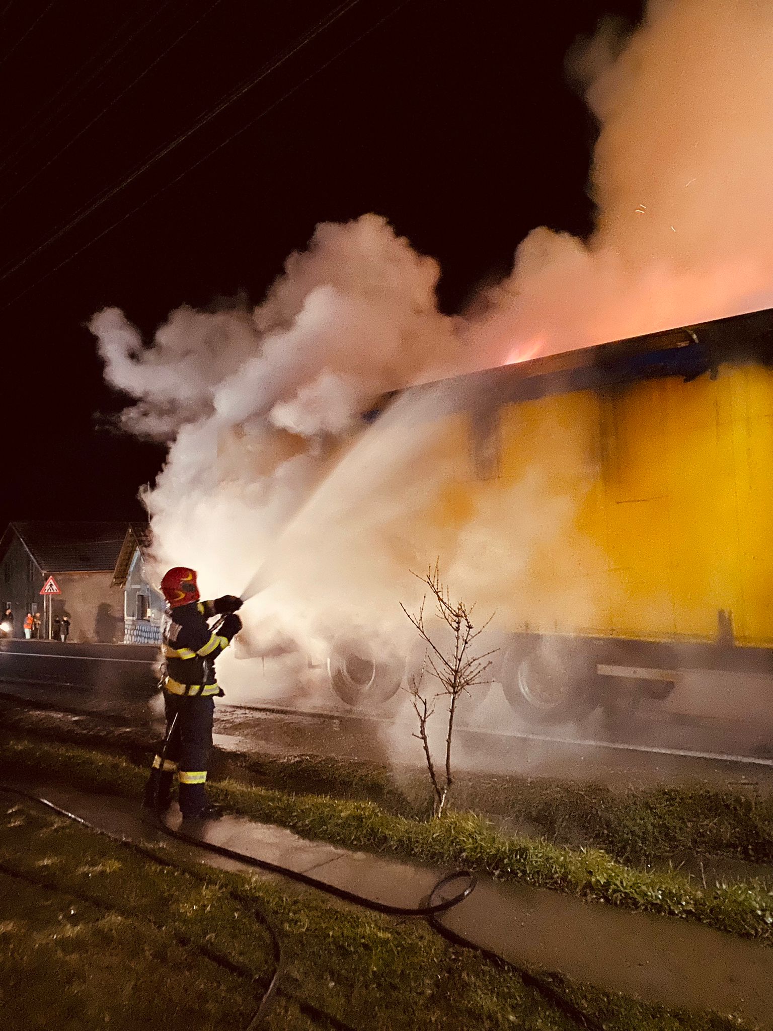 Un TIR și 20 de baloți de fân au ars în întregime, noaptea trecută, pe DN14, la Slimnic. Incendiul a izbucnit în jurul orei 21 și, preț de aproape patru ore, pompierii au intervenit pentru a-l lichida.