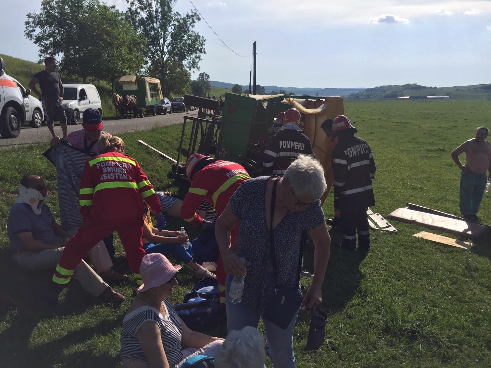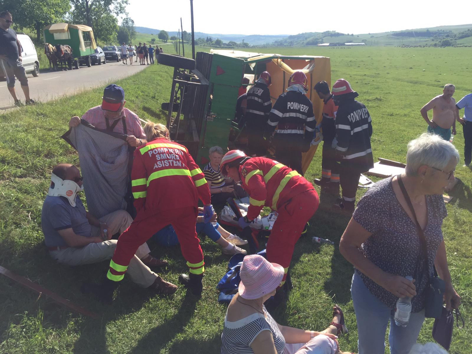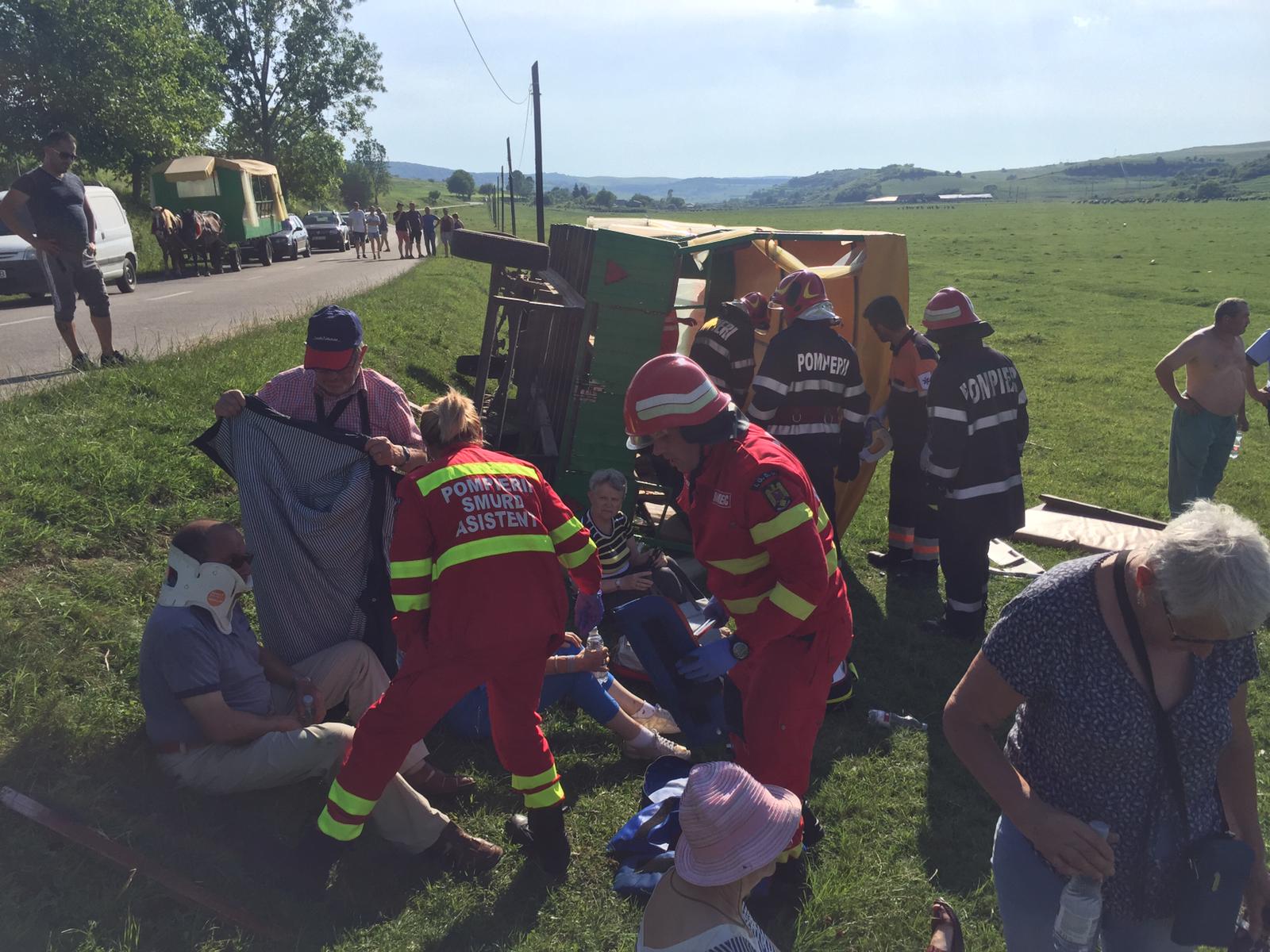 Inspectoratul pentru Situații de Urgență Sibiu a intervenit cu un număr de patru echipaje SMURD, trei echipaje de pompieri și autospeciala de salvare victime multiple pe Drumul Județean 142B între localitățile Boian și Bazna pentru acordarea asistenței medicale pentru cei nouă turiști străini care s-au răsturnat cu căruța.