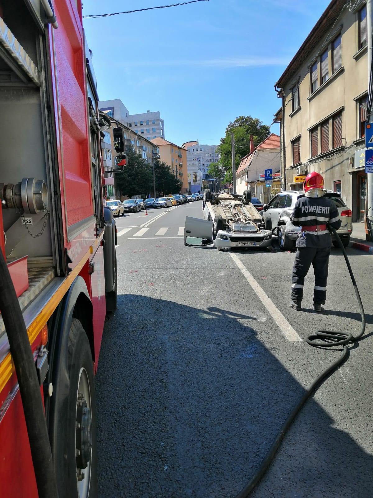 Un autoturism s-a răsturnat și alte două au fost avariate, în urma unui accident produs in giratoriul de la intersecția V. Milea cu Calea Dumbrăvii. Șoferul care a produs accidentul a fost rănit.