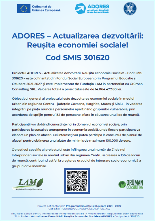Proiectul ADORES – Actualizarea dezvoltării: Reușita economiei sociale! – Cod SMIS 301620 – cofinanțat din Fondul Social European prin Programul Educație și Ocupare 2021-2027, este implementat de Fundația LAM în parteneriat cu Grüman Consulting SRL. Proiectul are o valoare totală de 14.864.477,80 lei.