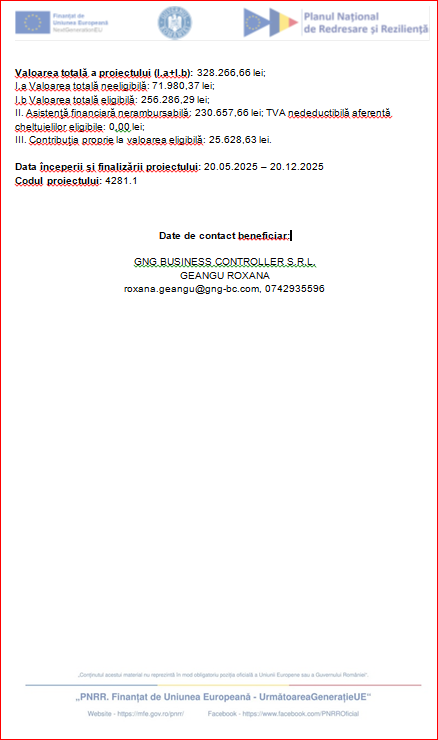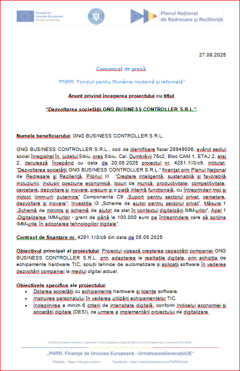 GNG BUSINESS CONTROLLER S.R.L., cod de identificare fiscal 28949006, având sediul social înregistrat în, județul Sibiu, oraș Sibiu, Cal. Dumbrăvii 76c2, Bloc CAM 1, ETAJ 2, etaj 2, derulează începând cu data de 20.05.2025 proiectul nr. 4281.1/i3/c9, intitulat: “Dezvoltarea societății GNG BUSINESS CONTROLLER S.R.L.” finanţat prin Planul Naţional de Redresare şi Rezilienţă, Pilonul III “Creștere inteligentă, sustenabilă și favorabilă incluziunii, inclusiv coeziune economică, locuri de muncă, productivitate, competitivitate, cercetare, dezvoltare și inovare, precum și o piață internă funcțională, cu întreprinderi mici și mijlocii (imm-uri) puternice” Componenta C9 „Suport pentru sectorul privat, cercetare, dezvoltare și inovare”, Investiția I3 „Scheme de ajutor pentru sectorul privat”, Măsura 1 „Schemă de minimis și schemă de ajutor de stat în contextul digitalizării IMM-urilor”, Apel 1 „Digitalizarea IMM-urilor – grant de până la 100.000 euro pe întreprindere care să sprijine IMM-urile în adoptarea tehnologiilor digitale”.