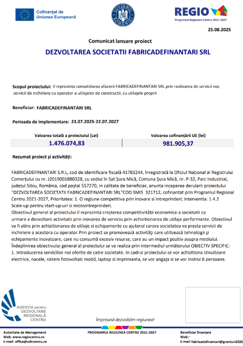 Rezumat proiect și activități: FABRICADEFINANTARI S.R.L, cod de identificare fiscală 41783244, înregistrată la Oficiul Național al Registrului Comerțului cu nr. J2019001880328, cu sediul în Sat Șura Mică, Comuna Șura Mică, nr. P-32, Parc Industrial, județul Sibiu, România, cod poștal 557270, in calitate de beneficiar, anunta inceperea derularii proiectului „DEZVOLTAREA SOCIETATII FABRICADEFINANTARI SRL”COD SMIS 321712, cofinantat prin Programul Regional Centru 2021-2027, Prioritatea: 1. O regiune competitiva prin inovare si intreprinderi; Interventia: 1.4.2 Scale-up pentru start-up-uri si microintreprinderi.