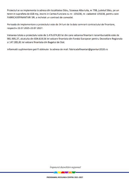 Proiectul se va implementa la adresa din localitatea Sibiu, Soseaua Alba Iulia, nr 79B, judetul Sibiu, pe un teren in suprafata de 658 mp, inscris in Cartea Funciara cu nr. 105638, nr. cadastral 105638, pentru care FABRICADEFINANTARI SRL a incheiat un contract de comodat.