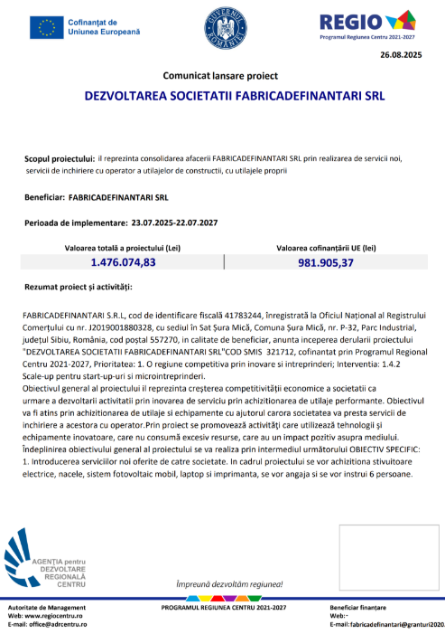 Rezumat proiect și activități: FABRICADEFINANTARI S.R.L, cod de identificare fiscală 41783244, înregistrată la Oficiul Național al Registrului Comerțului cu nr. J2019001880328, cu sediul în Sat Șura Mică, Comuna Șura Mică, nr. P-32, Parc Industrial, județul Sibiu, România, cod poștal 557270, in calitate de beneficiar, anunta inceperea derularii proiectului „DEZVOLTAREA SOCIETATII FABRICADEFINANTARI SRL”COD SMIS 321712, cofinantat prin Programul Regional Centru 2021-2027, Prioritatea: 1. O regiune competitiva prin inovare si intreprinderi; Interventia: 1.4.2 Scale-up pentru start-up-uri si microintreprinderi.