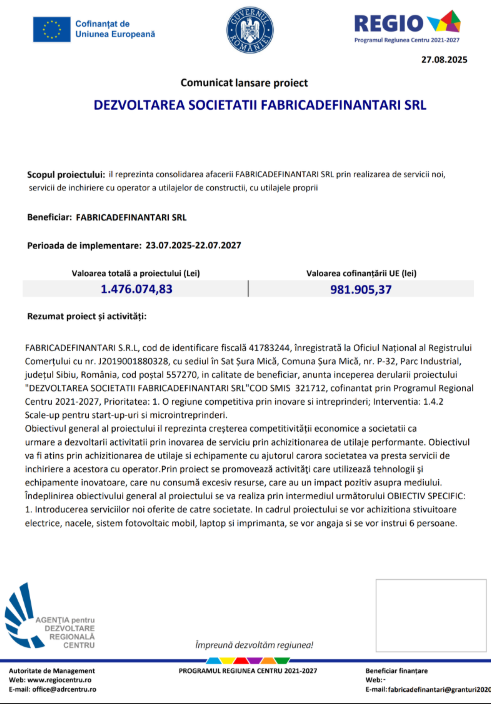 Rezumat proiect și activități: FABRICADEFINANTARI S.R.L, cod de identificare fiscală 41783244, înregistrată la Oficiul Național al Registrului Comerțului cu nr. J2019001880328, cu sediul în Sat Șura Mică, Comuna Șura Mică, nr. P-32, Parc Industrial, județul Sibiu, România, cod poștal 557270, in calitate de beneficiar, anunta inceperea derularii proiectului „DEZVOLTAREA SOCIETATII FABRICADEFINANTARI SRL”COD SMIS 321712, cofinantat prin Programul Regional Centru 2021-2027, Prioritatea: 1. O regiune competitiva prin inovare si intreprinderi; Interventia: 1.4.2 Scale-up pentru start-up-uri si microintreprinderi.