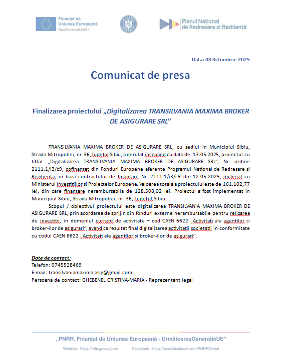 TRANSILVANIA MAXIMA BROKER DE ASIGURARE SRL, cu sediul in Municipiul Sibiu, Strada Mitropoliei, nr. 36, Judetul Sibiu, a derulat incepand cu data de  13.05.2025, proiectul cu titlul „Digitalizarea TRANSILVANIA MAXIMA BROKER DE ASIGURARE SRL”, Nr. ordine 2111.1/i3/c9, cofinantat din Fonduri Europene aferente Programul National de Redresare si Rezilienta, in baza contractului de finantare Nr. 2111.1/i3/c9 din 12.05.2025, incheiat cu Ministerul Investitiilor si Proiectelor Europene. Valoarea totala a proiectului este de 161.102,77 lei, din care finantare nerambursabila de 128.508,02 lei. Proiectul a fost implementat in Municipiul Sibiu, Strada Mitropoliei, nr. 36, Judetul Sibiu.