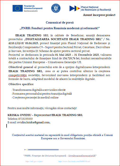 ERALK TRADING SRL în calitate de Beneficiar, anunță demararea proiectului „DIGITALIZAREA SOCIETATII ERALK TRADING SRL” / Nr. 4210.1/i3/c9/ 08.04.2025, proiect finanțat prin Planul Național de Redresare și Reziliență, Componenta C9 – Suport pentru Sectorul Privat, Cercetare, Dezvoltare și Inovare, Investiția I3: Scheme de ajutor pentru sectorul privat.