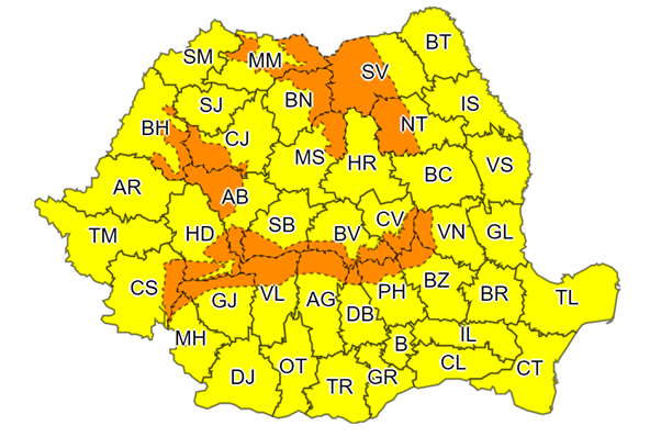 Prima avertizare Cod Galben de vânt puternic este valabilă de la ora 10 până la ora 16, local în Oltenia, Transilvania, Moldova, nordul Crișanei și sud-vestul Munteniei, conform hărții. Rafalele de vânt vor fi de 55-70 Km/oră, iar la munte de 70-90 Km/oră. La altitudini mai mari de 1.500 de metri va viscoli și vizibilitatea va fi redusă.
