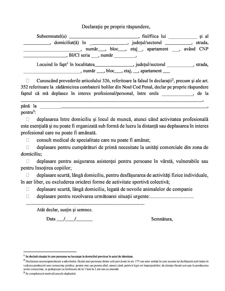 Menționăm faptul că, potrivit Ordonanței Militare numărul 2 din 21 martie 2020 obligația completării declarației pe proprie răspundere se instituie începând cu ora 22 a zilei de 23 martie 2020.