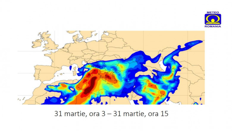 „Circulația aerului, între 30 martie și 1 aprilie, se va face din sector preponderent sud-vestic și sudic, iar spre final vestic, astfel că va favoriza avansul dinspre nordul Africii a unei mase de aer tropical, încărcată cu particule de praf cu origine sahariană, îndeosebi către sudul și sud-estul Europei, inclusiv în zona României”, transmite ANM. Este posibil ca volumul de praf care va ajunge deasupra României să nu fie la fel de mare precum cel anterior. ANM spune că vom avea o concentrație a particulelor de praf mai redusă în comparație cu cele din sudul Peninsulei Italice și al Peninsulei Balcanice.